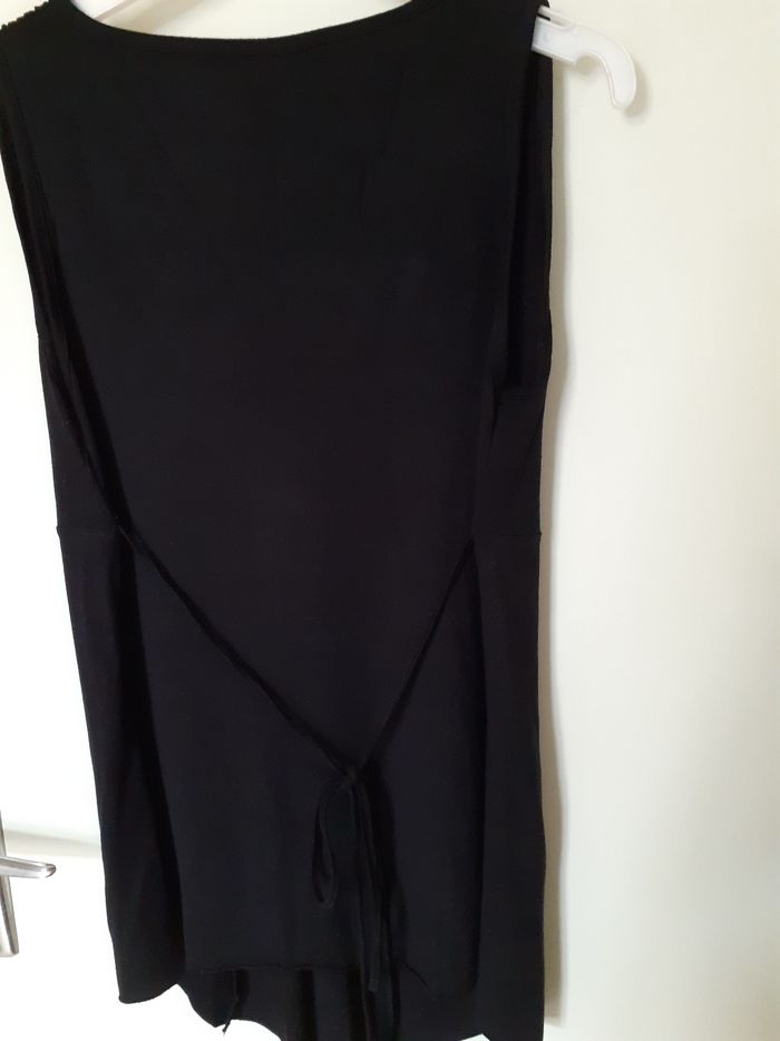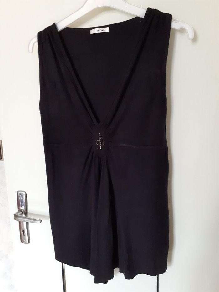 Vends une tunique de grossesse sans manche 96%viscose 4% elasthanne couleur noire marque Ange taille 1. Longueur dans le dos : 60 cm