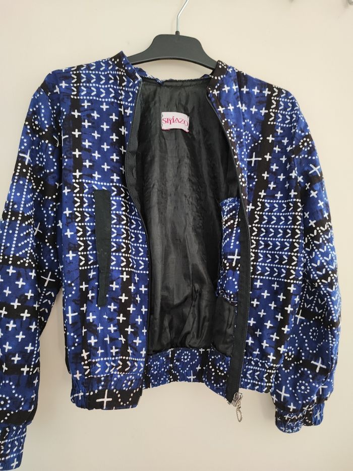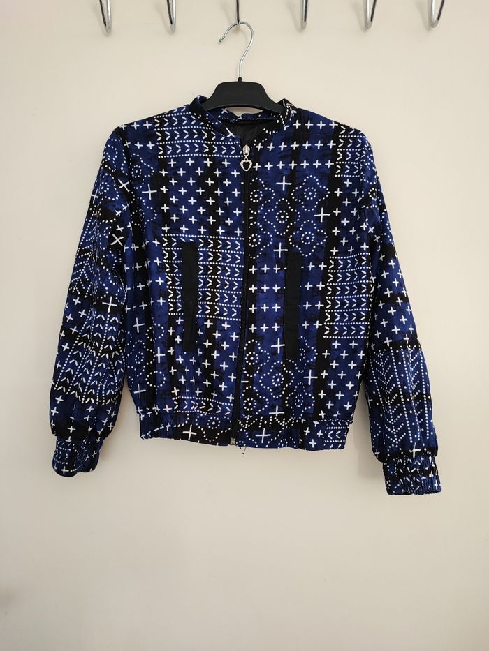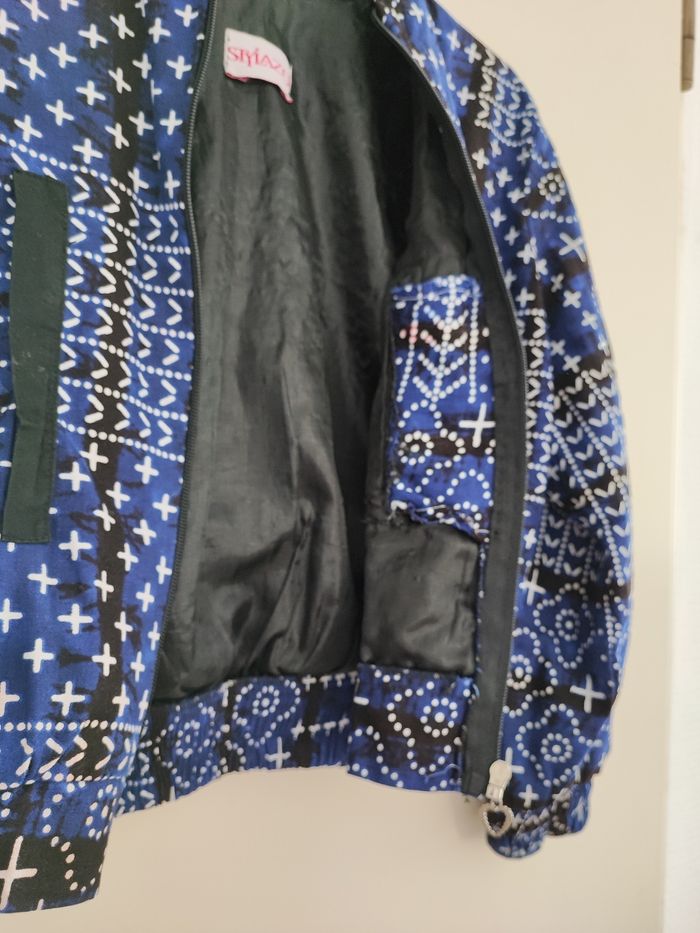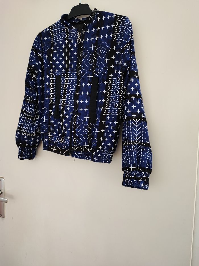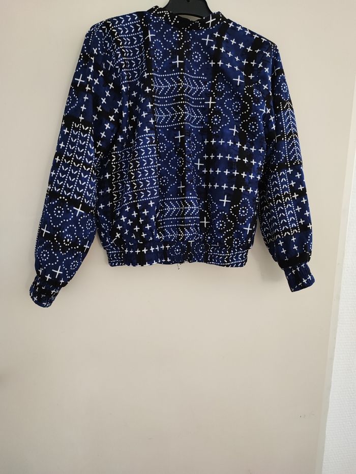 Superbe blouson fille Intérieur doublé fluide Bas et bas des manches resserrées par un élastique Intérieur fausse poches Attention les coutures sont grossières le Style est fait comme cela Taille 8 ans Coloris bleu avec bel imprimé