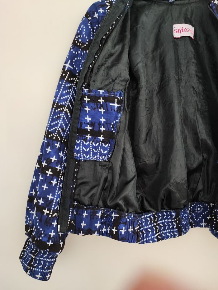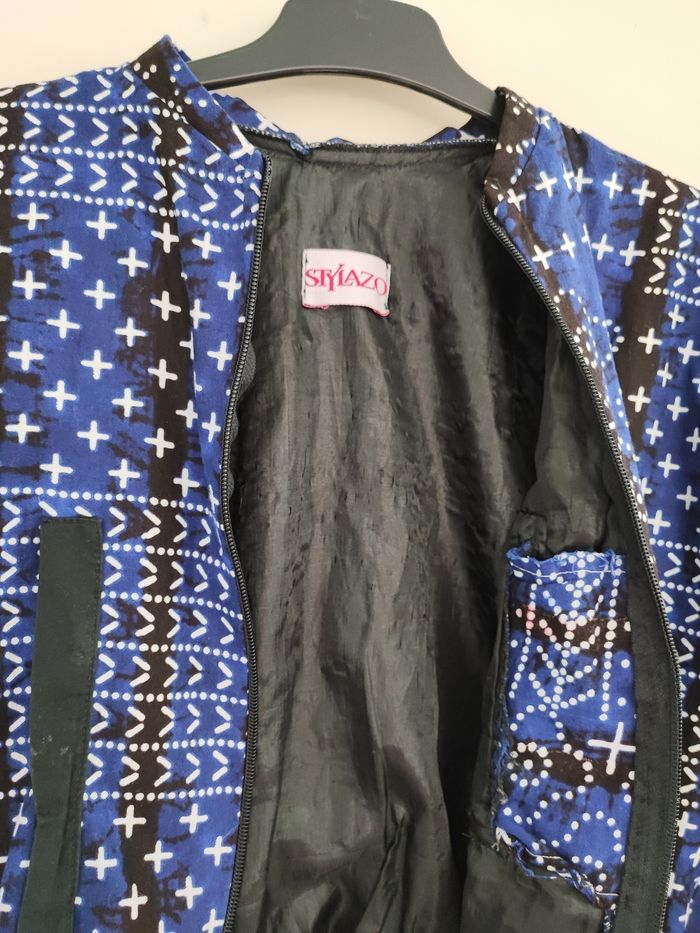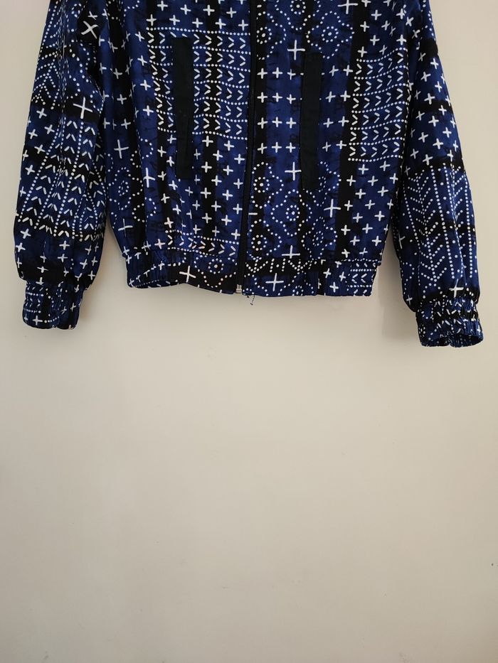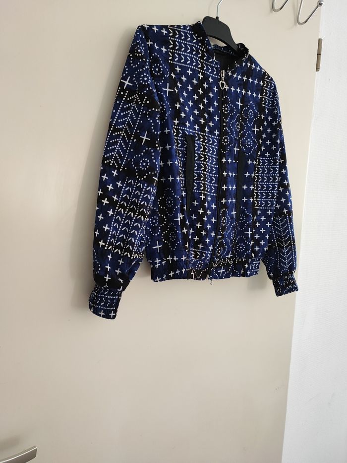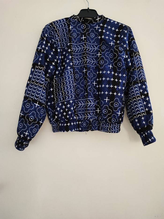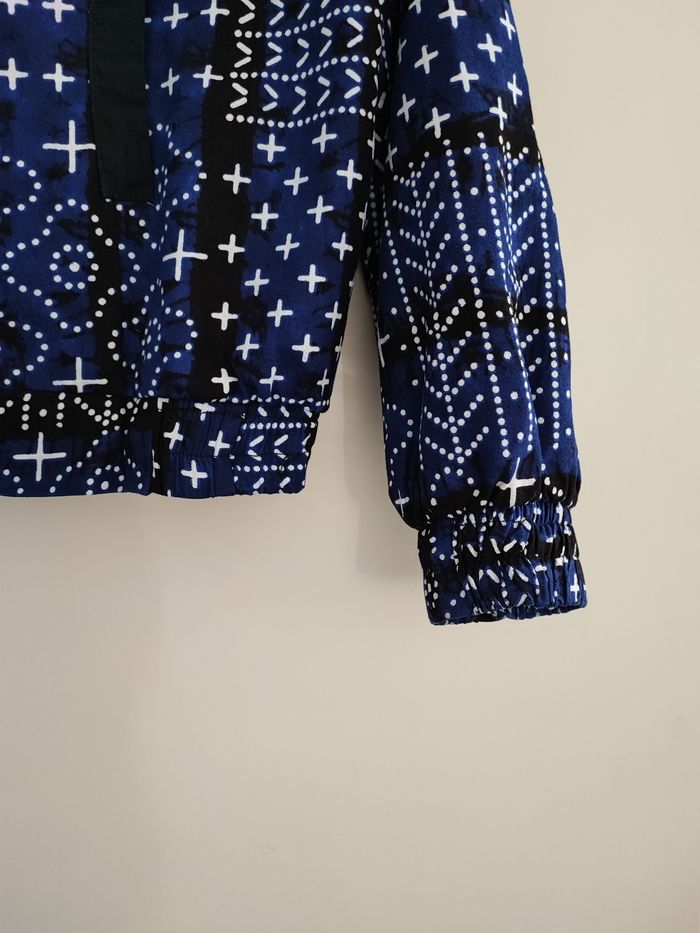 Superbe blouson fille Intérieur doublé fluide Bas et bas des manches resserrées par un élastique Intérieur fausse poches Attention les coutures sont grossières le Style est fait comme cela Taille 8 ans Coloris bleu avec bel imprimé