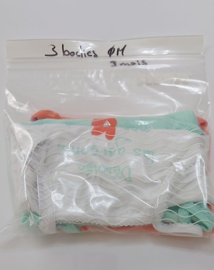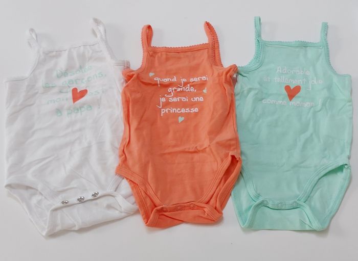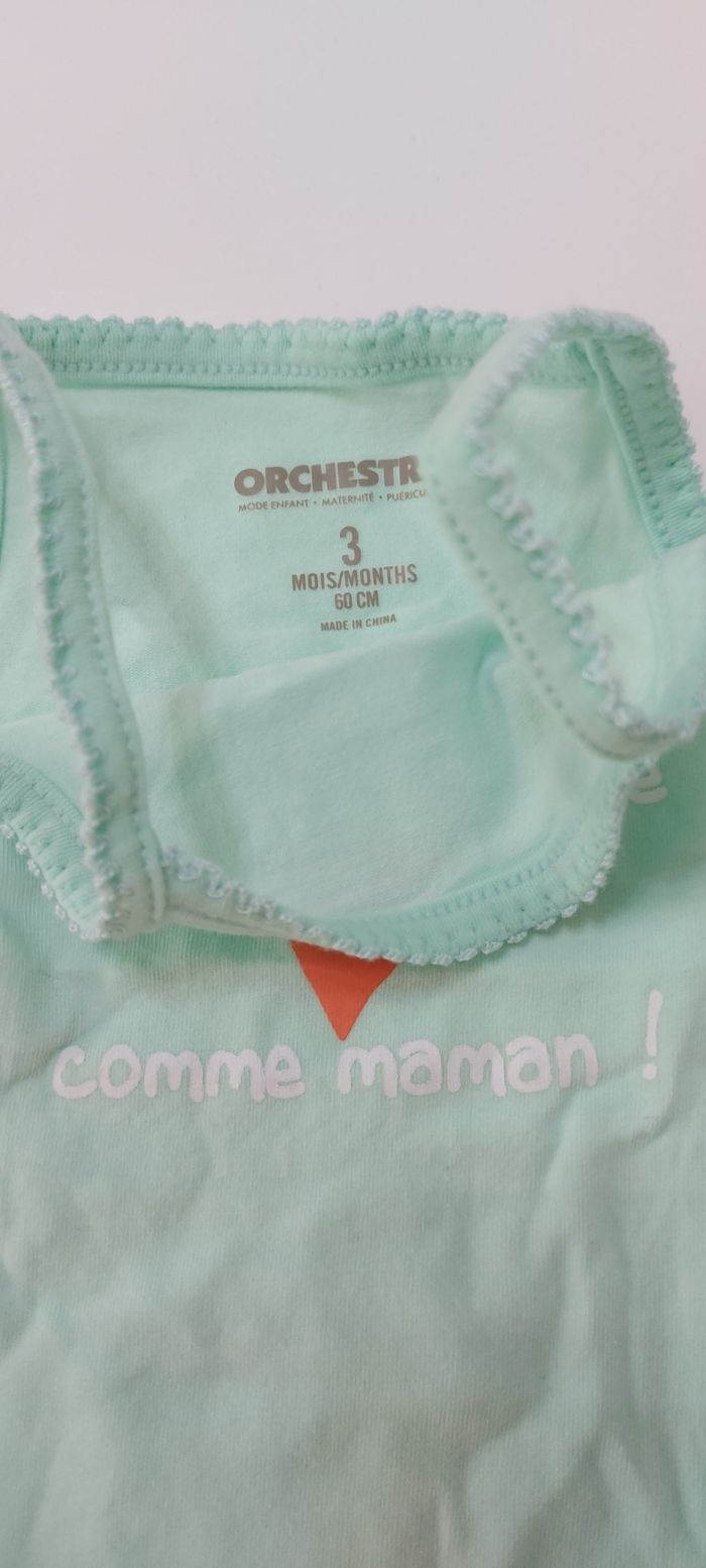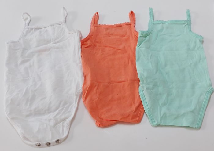 Lot de 3 bodies bretelles 3 mois Orchestra Un blanc, un orange et un bleu turquoise Sans tâches, ni trous.