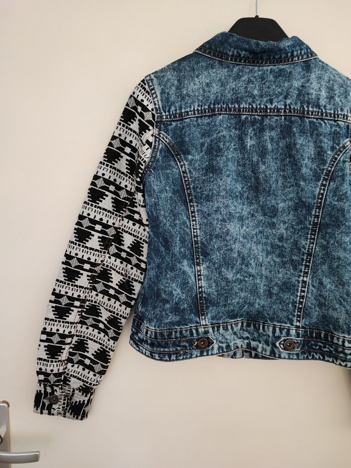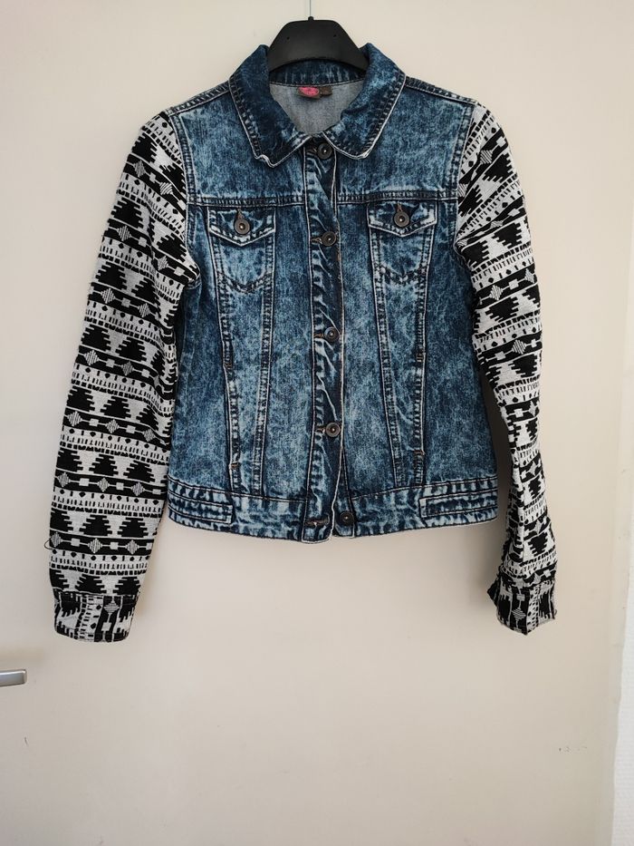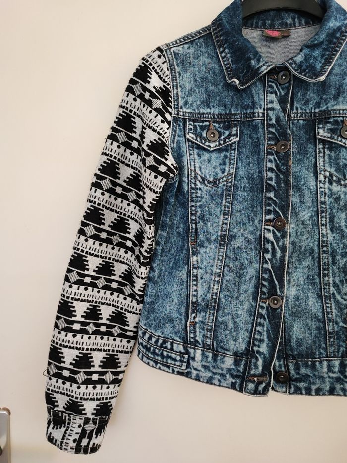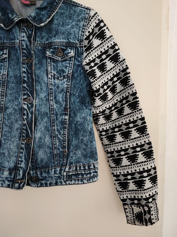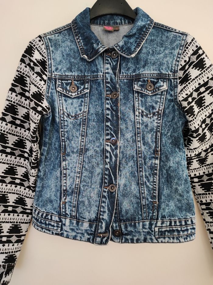 Magnifique veste jean garçon 2 tons Le milieu est en jean délavé Manches en tissu avec Motifs Original et chic à porter Taille 12 ans ,