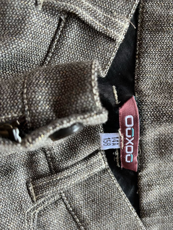 Poches devant et derrière. Motif chiné marron et doré. Ooxoo est une marque Marèse. Patte de boutonnage à la base des jambes. Fermeture par zip et bouton. Composition 49% laine, 48% polyester, 2% élasthanne et 1%l lurex. Aucun défaut.