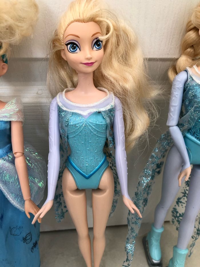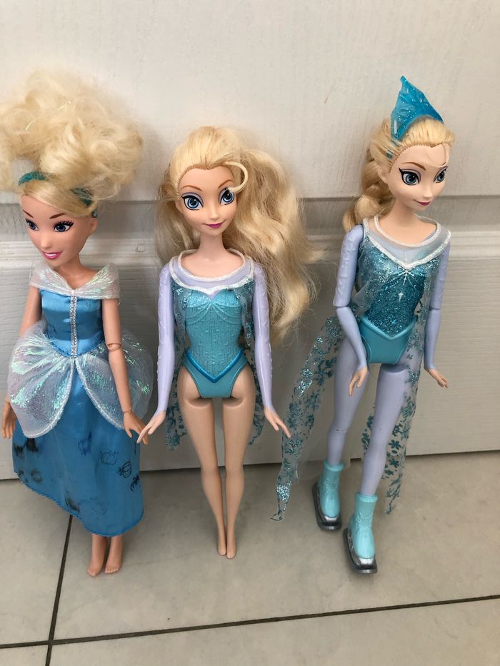 Lot composé de 3 poupées mannequin deux de Elsa une Cendrillon, la robe de Cendrillon, quelque peu esquinté. Les trois poupées sont en excellent état.