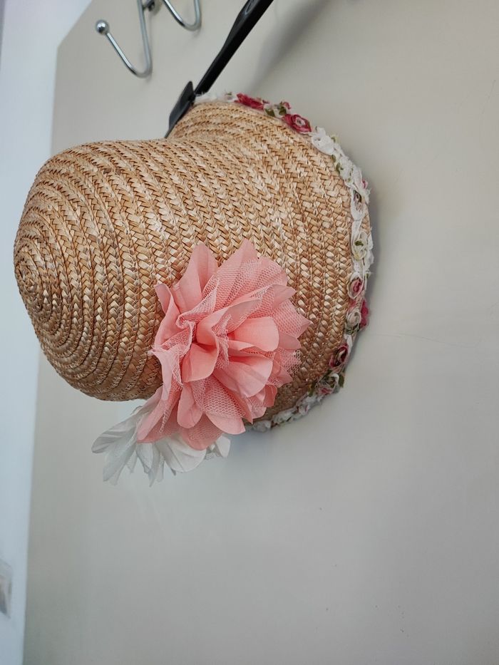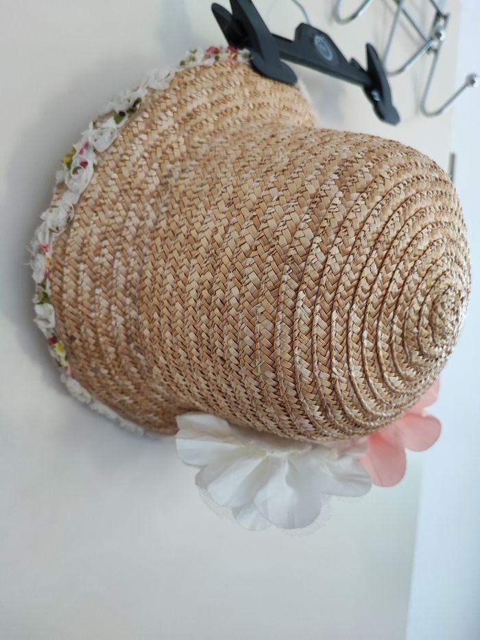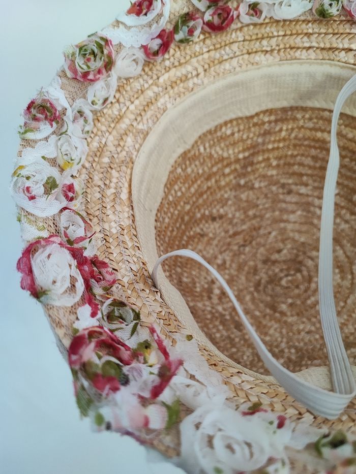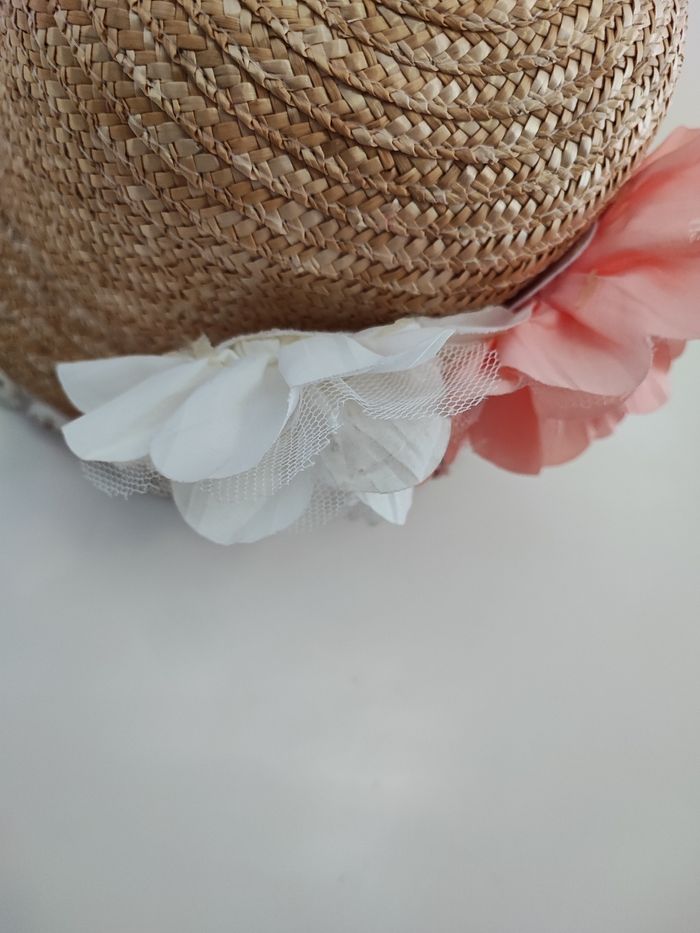 Superbe chapeau de paille fille Contour orné de fleurs tissu Grosse fleur à l'arrière Attention la fleur blanche est a recoller Coloris jaune paille Taille environ 4/7 ans Élastique de maintien a l'intérieur