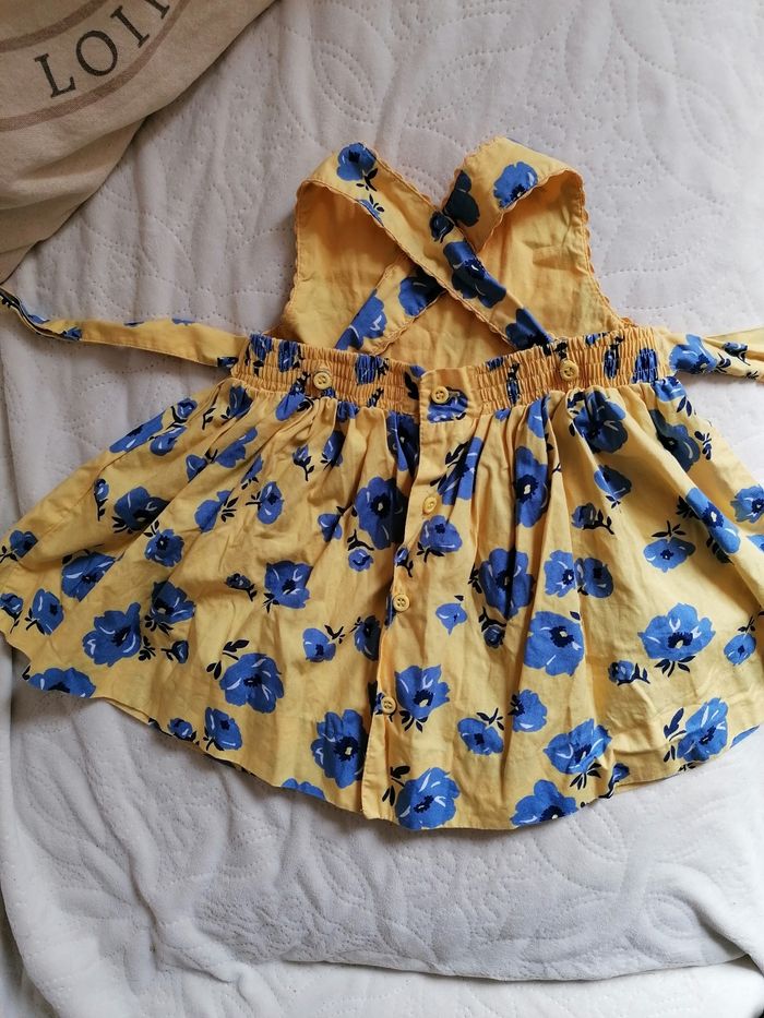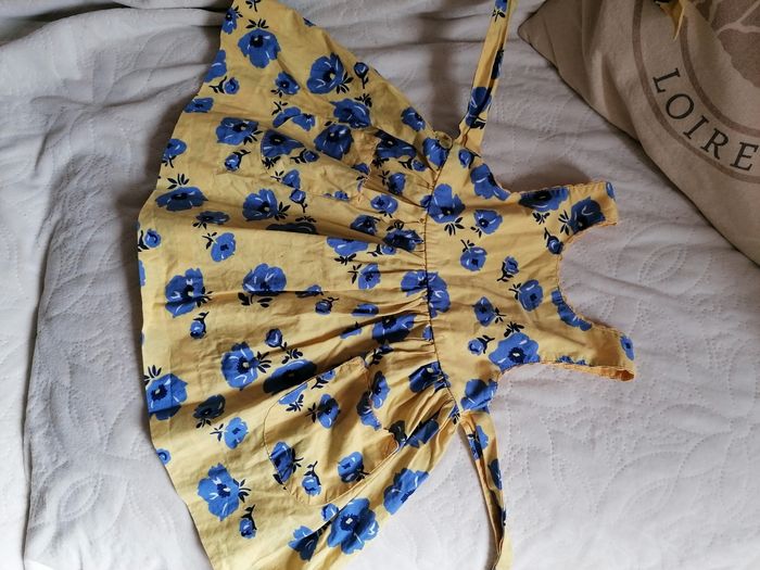 Robe type provençale jaune à fleurs bleues. Quelques décoloration autour de la ceibture, cf photo, mais il faut vraiment avoir l'oeil dessus. Bretelles amovibles au dos. Grand 6 mois