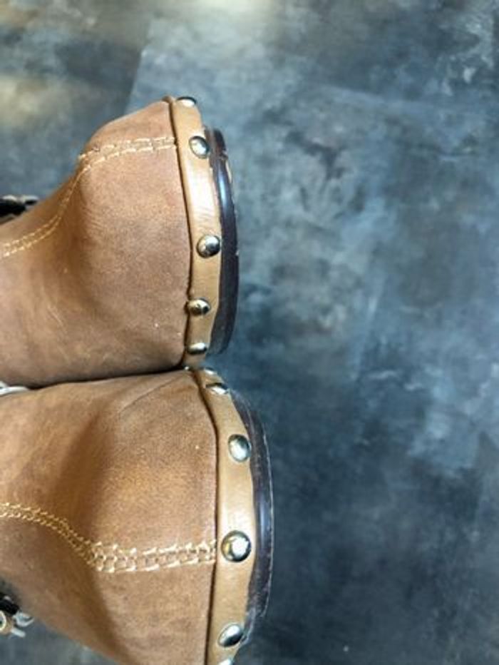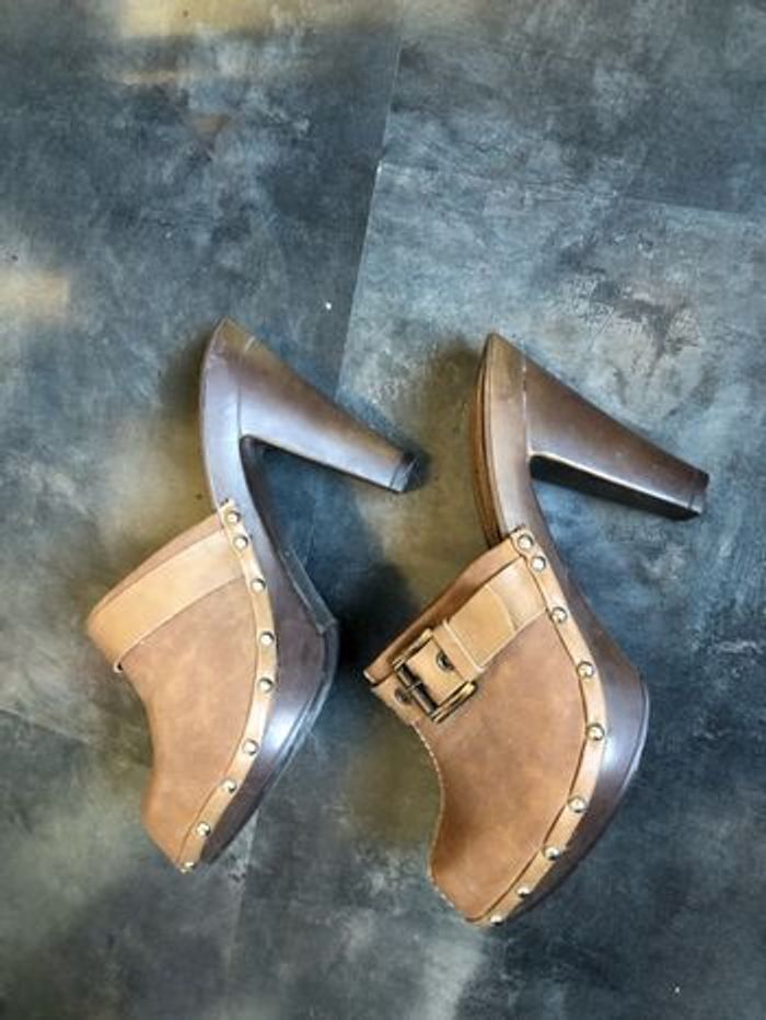Sabots à talons Aspect cuir vieilli avec clous Indique un 38 mais conviendraient mieux pour un 37 Donc pointent petit Marque Mim Hauteur à la marche environ 7,5 cm Portés une fois.