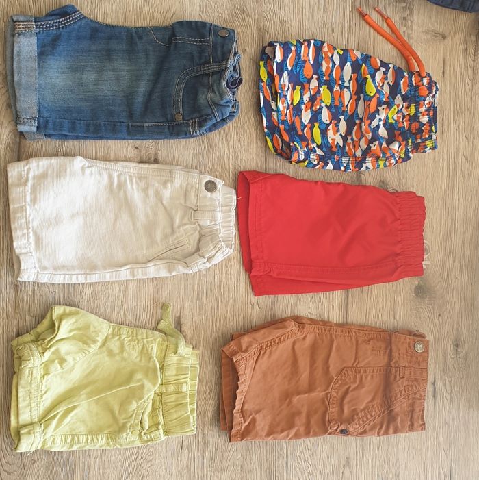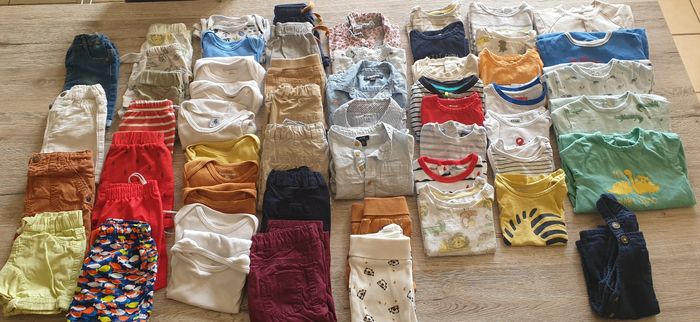 Lot vêtements garçon 12 mois léger Contient 58 articles Vêtements en très bon état Sans taches ni trou Certains vêtements n'ont jamais été porté Contient : - 5 pyjamas épais - 15 tee shirt manches courtes dont 2 marcel - 5 chemises - 9 pantalons dont 2 pas de pyjama - 13 shorts dont 2 maillots de bain - 10 bodys dont 6 marcel - 1 salopette short