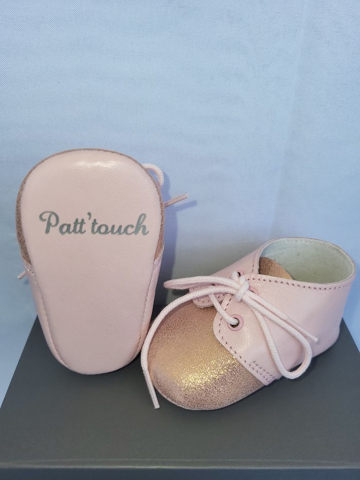 Chaussures pour bébés couchés tout en cuir souple rose irisé, doublé non-tissé, semelle intérieure en cuir blanc, de la marque PATT'TOUCH Une grande marque française de chaussures pour bébés et enfants de très belle qualité, entièrement dessinées et fabriquées dans un atelier familial du sud-ouest de la France Pointure 16 (0-3 mois) Longueur de la semelle intérieure environ 8.6 cm Emballage d'origine en coffret gris avec ruban écru, idéal pour offrir ou se faire plaisir ! Neuves, jamais portées Envoi sous 24h
