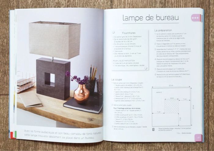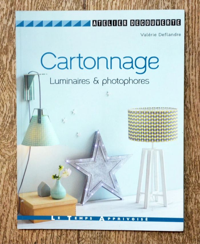 Livre Cartonnage, luminaires et photophores, technique cartonnage, luminaire en carton, créations en carton, lampe en carton, photophore Livre de loisirs créatifs, cartonnage. 13 créations à confectionner. Edition Le Temps apprivoisé, collection atelier découverte. Auteure : Valérie Deflandre. Couverture cartonnée souple, 64 pages. ISBN : 978-2-299-00257-6