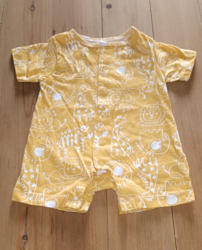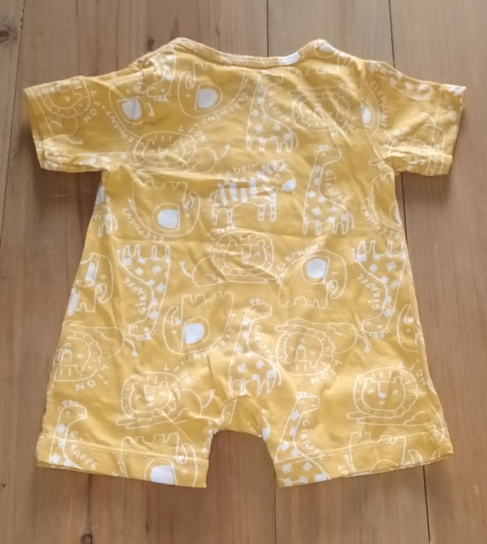 Combinaison jaune avec animaux. Ouverture par le devant. Jamais porté mais sans étiquette. Taille : 1 mois.
