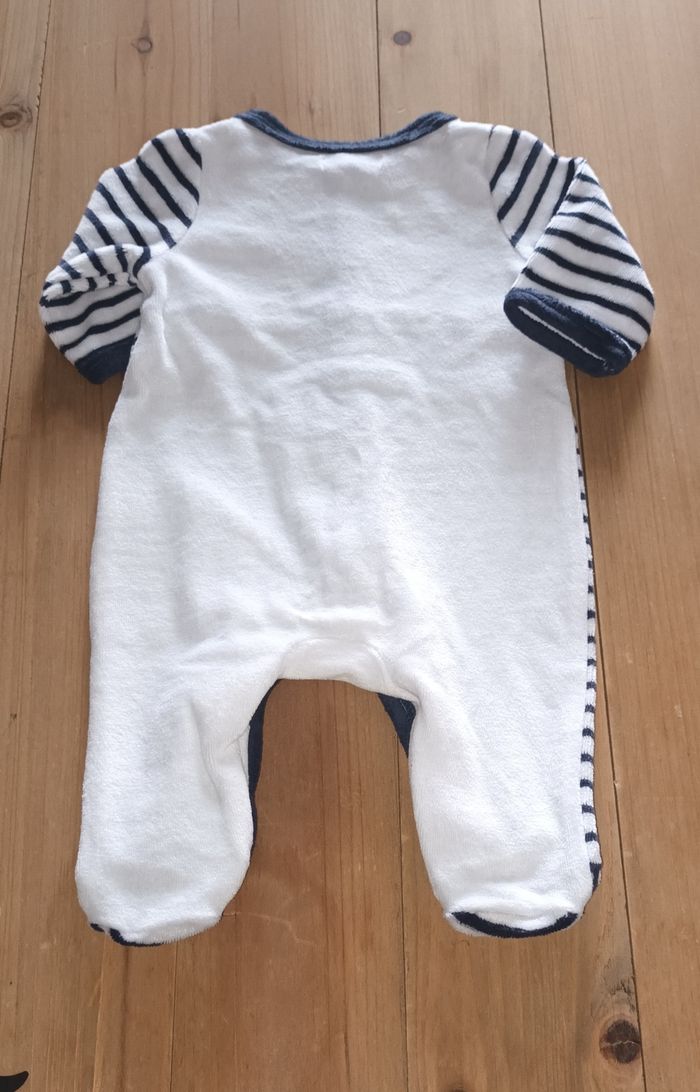 Pyjama blanc rayé bleu nuit. Ouverture par le devant avec pressions. Jamais porté mais sans étiquette. Taille : 1 mois