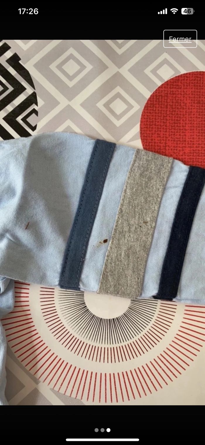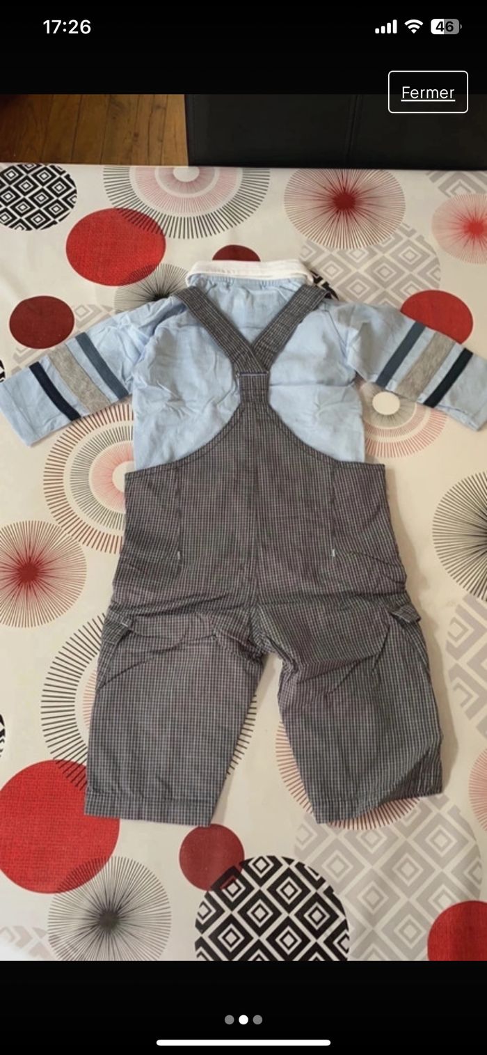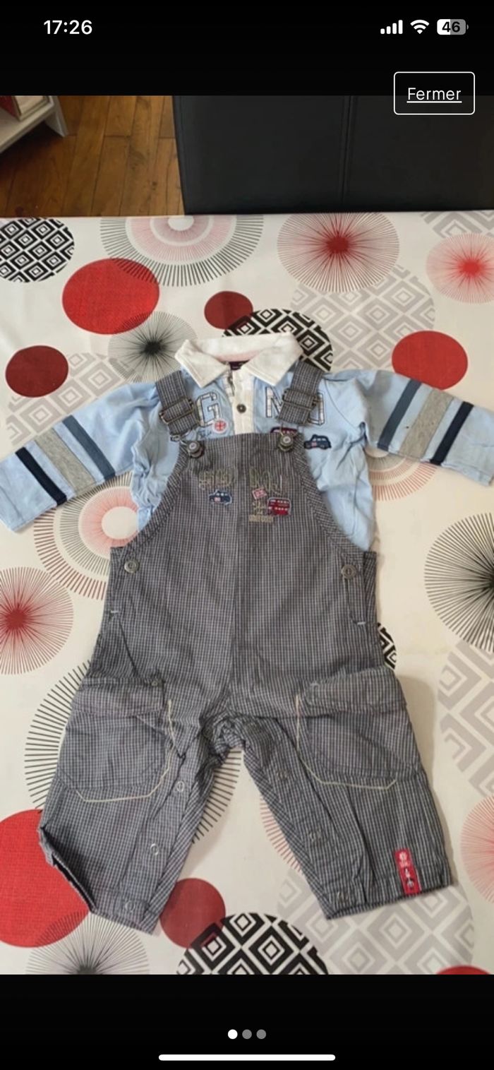 Salopette avec des pressions à l’entrejambe, très bon état T-shirt col polo avec une petite tache sur une manche