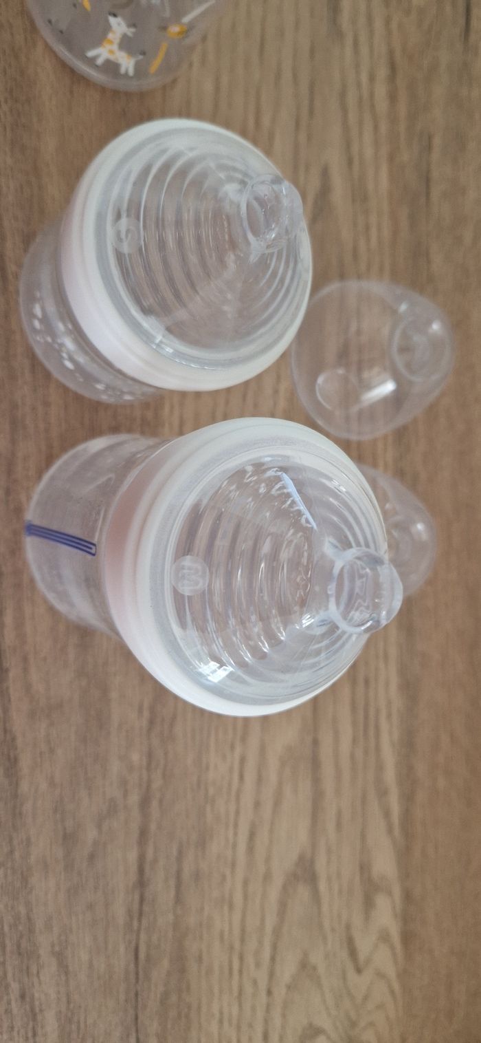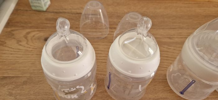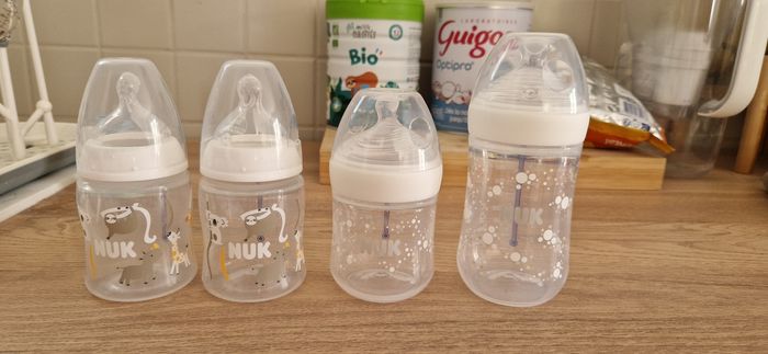 Lot de 4 biberons nuk Une tetine taille S et trois tetine taille M Deux tétines sont des tétines natural sense inspiré du sein maternel 3 sont neuf et un à servit 2 fois mais ne convient pas à mon bebe