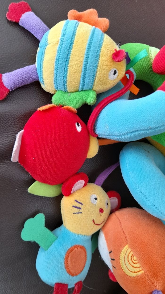 Chat et ses copains à accrocher autour d un transat ou d une poussette ou siège auto, pour éveiller bébé. La tête du chat ainsi que le poisson et l oiseau ont des éléments sonores à secouer, le chat a un "pouët" à appuyer. Très bon état, marque française Le Petit Nouveau, lavable en machine .