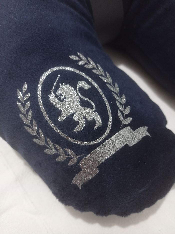 Coussin de voyage couleur bleu marine, dessus toucher velours, motif pailleté gris glitter.