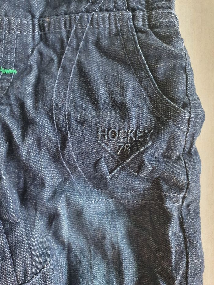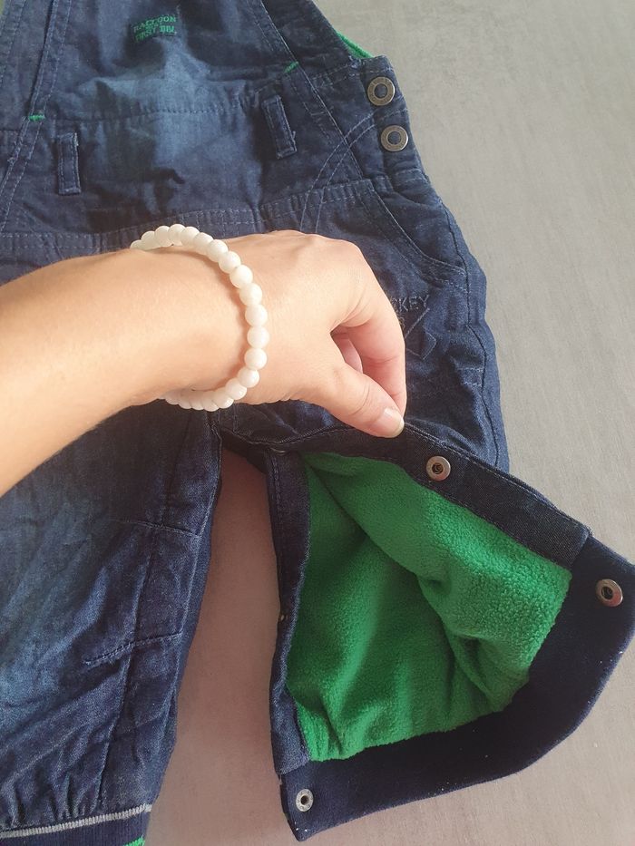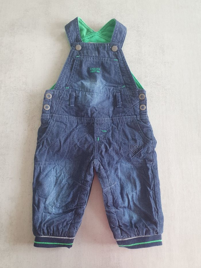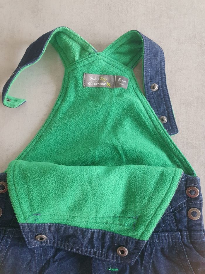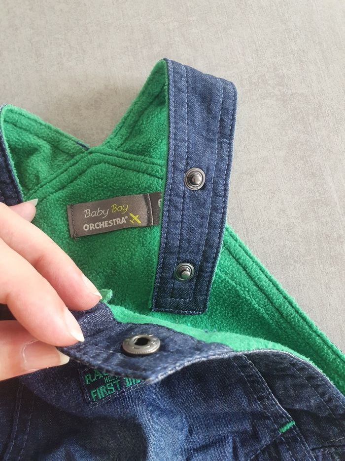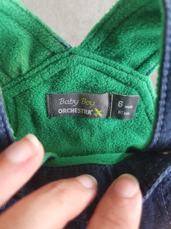 Salopette marine en jean pour l'hiver. Entièrement doublée polaire, bien chaude. Très bon état, marque orchestra taille 6 mois 2 niveaux de réglage aux épaules, ouverture pratique entrejambe