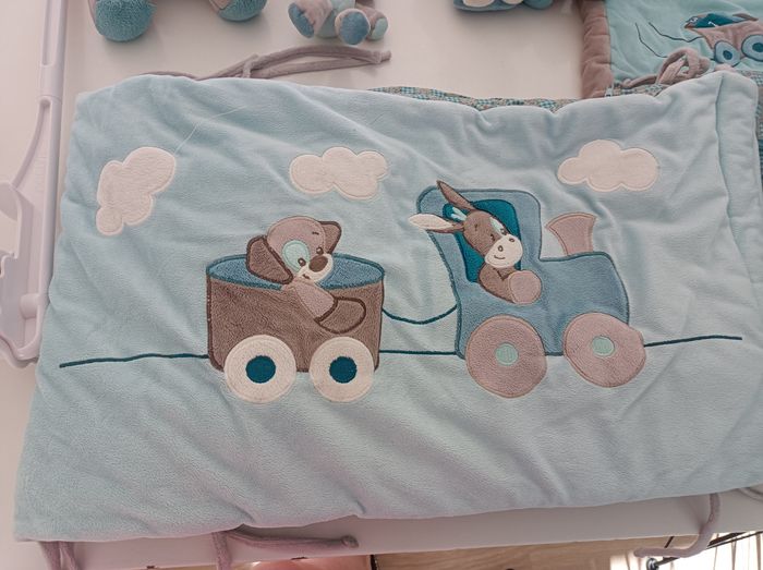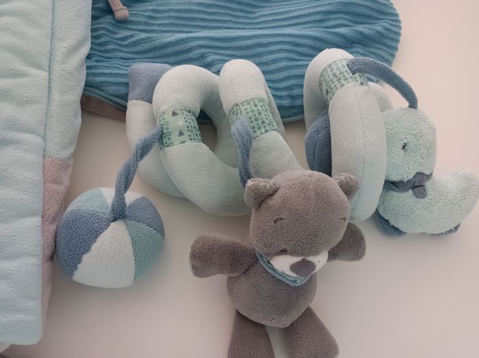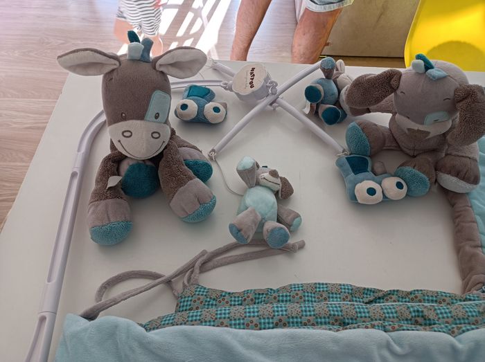 Un mobile Deux peluches Un tour de lit Une gigoteuse 0 6 mois Un jouet poussette Le lot 30 euros