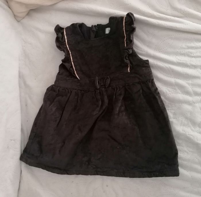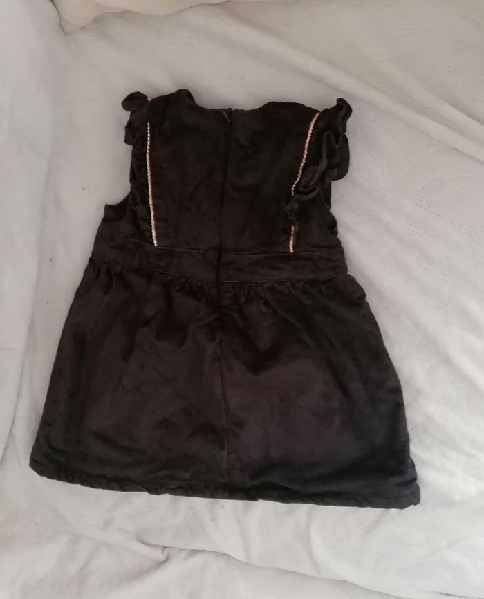Robe noire en velours, détails dorés sur le torse et noeud à la ceinture. Tbe mais semble tailler petit (peu portée). Fermeture éclair à l'arrière.