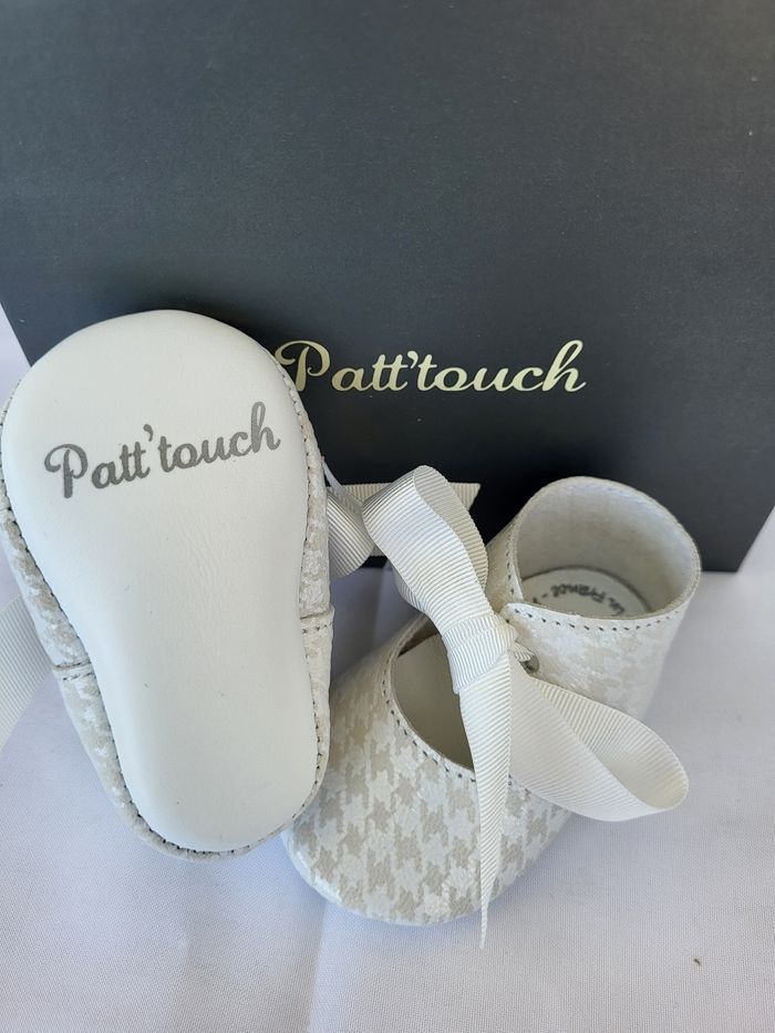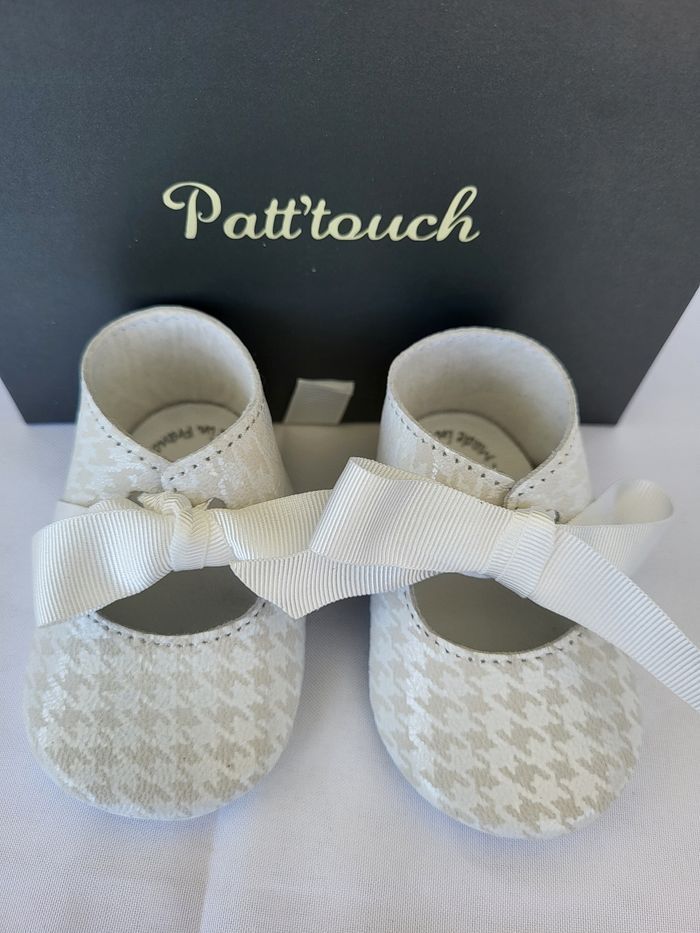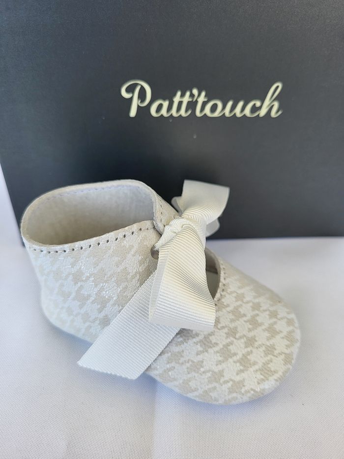 Chaussures pour bébés couchés tout en cuir souple imprimé pied de poule, doublé non-tissé, semelle extérieure en cuir blanc, semelle intérieure en cuir blanc, de la marque PATT'TOUCH Une grande marque française de chaussures pour bébés et enfants de très belle qualité, entièrement dessinées et fabriquées dans un atelier familial du sud-ouest Pointure 16 (0-3 mois) Longueur de la semelle intérieure environ 8.6 cm Emballage d'origine en coffret gris avec ruban écru au nom de la marque Neuves, jamais portées Envoi sous 24h