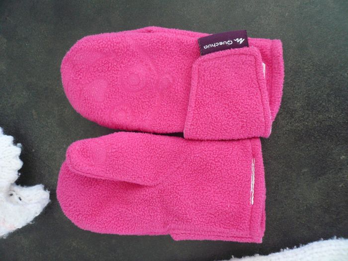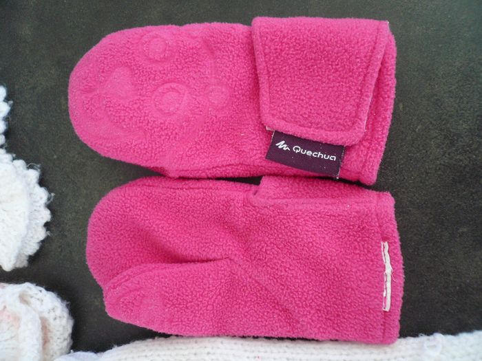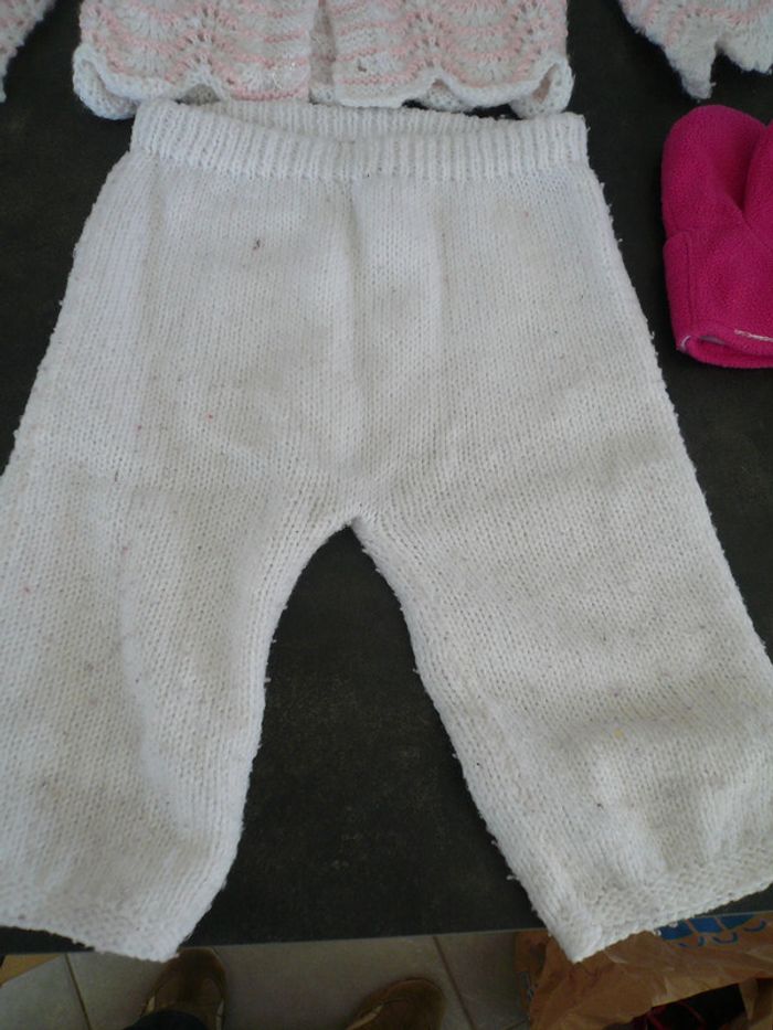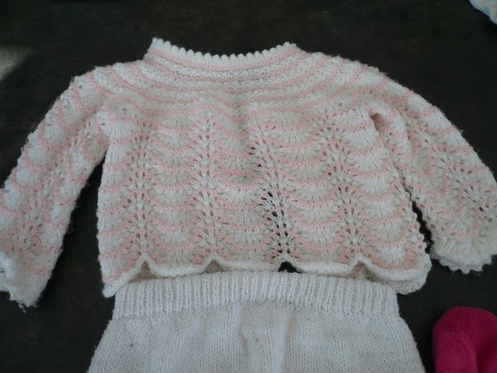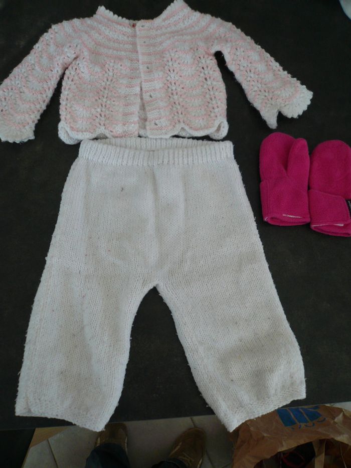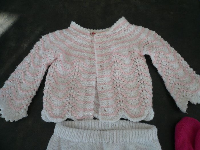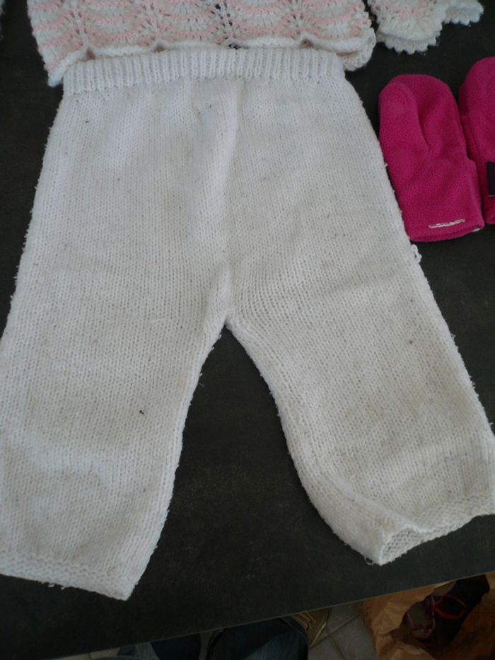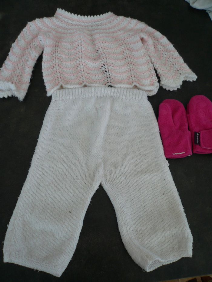 lot composé - d'un gilet tricoté main blanc et rose . très bon état. juste noté LEA à l'intérieur au col (visible sur le photo) mais ne ce voit pas une fois mis. correspond à un bébé de 3/6mois. -pantalon tricoté main. taille élastiquée. bon état mais un peu bouloché. taille environ 3/6 mois -Moufle rose. marque quechua. A scratch pour faciliter l'enfilage. très bon état. taille environ 6 mois 1.50€/ pièce ou 3,50€ le lot
