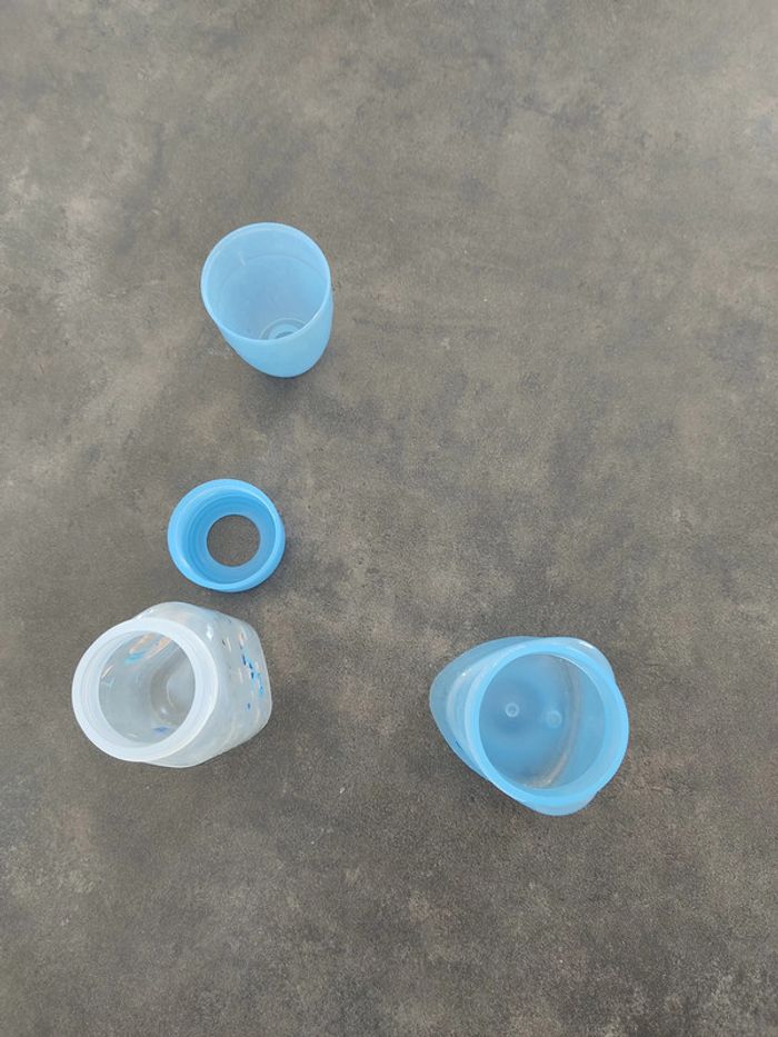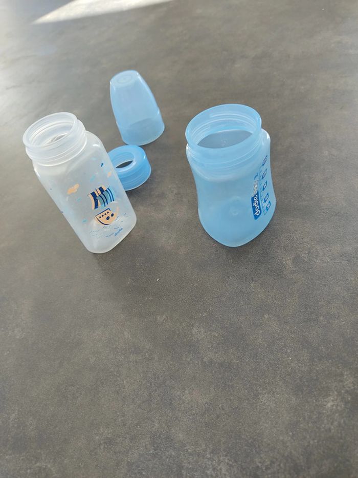 Vends 2 petits biberons avec prise triangulaire pour faciliter la prise en main. Le premier avec le bouchon, Le deuxième sans bouchon (marque dodie 150ml)