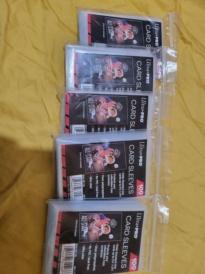 5 Lots de 100 protèges cartes transparents. 100 sleeves par lot. Soit 500 pochettes. Attention c'est légèrement plus grand qu'une carte pokemon ou magic. Ce n'est pas pile pile cf photo
