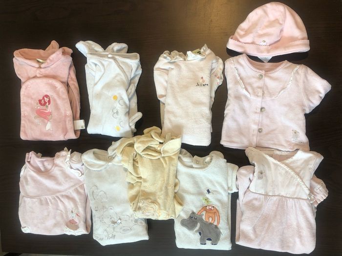 Lot de 9 pyjamas en velours dont 1 sans manches avec un gilet assorti 6 pyjamas sergent major avec bonnet assorti de la même marque 1 Kiabi Très bon état Un pyjama blanc à ses pressions légèrement décousues au niveau de la couche