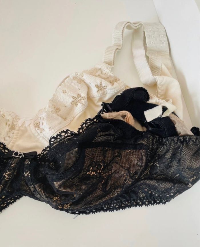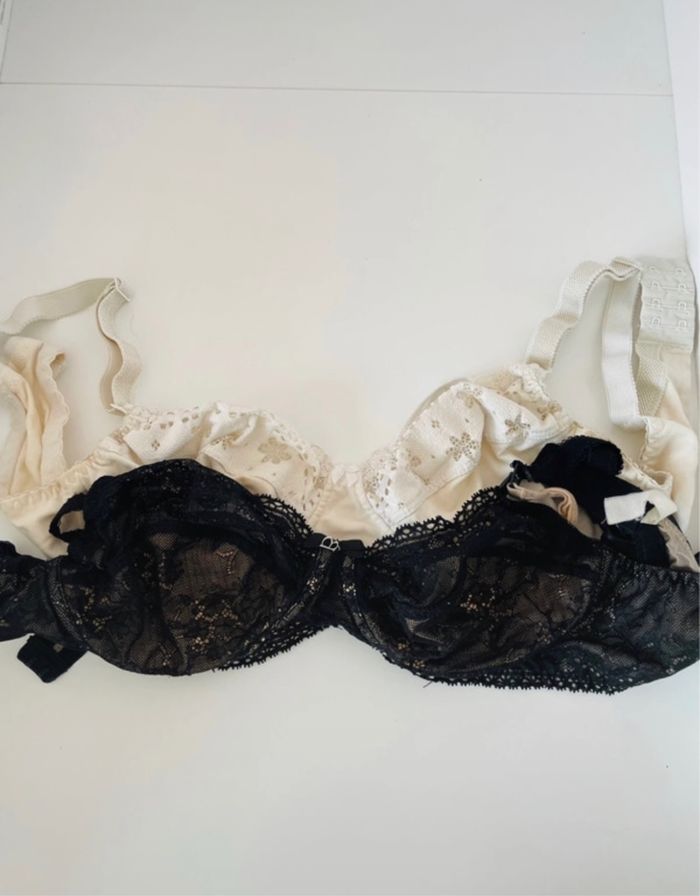 Lots de deux soutien-gorge de grossesse taille 85, B Le noir est en bon état général de la barque. Bestform, plus d’étiquette mais taille 85 B. Le deuxième blanc qui a un peu perdu de sa couleur. Taille 85, B. Marque influx