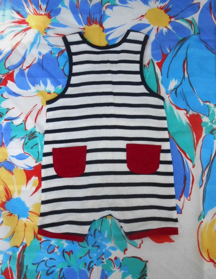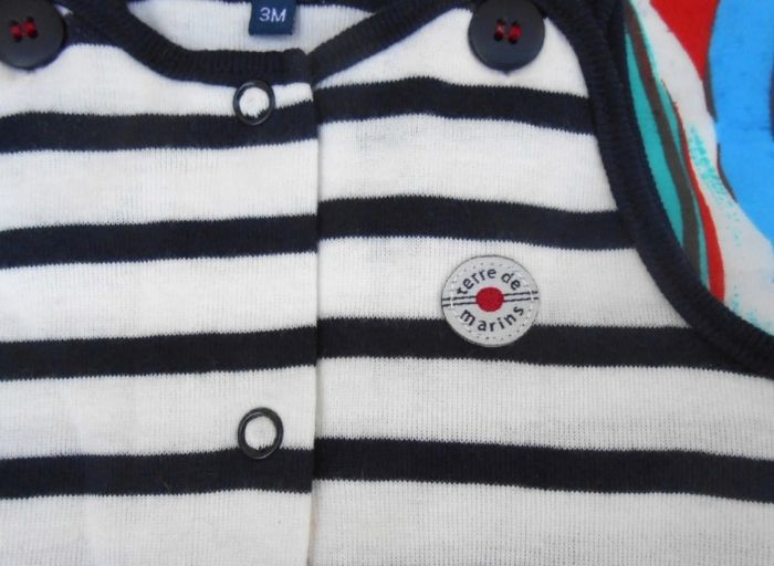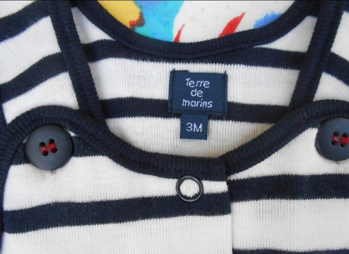 Style marinière, sans manche. Très bon état, très peu porté. Marque : Terre de Marins Taille 3 mois