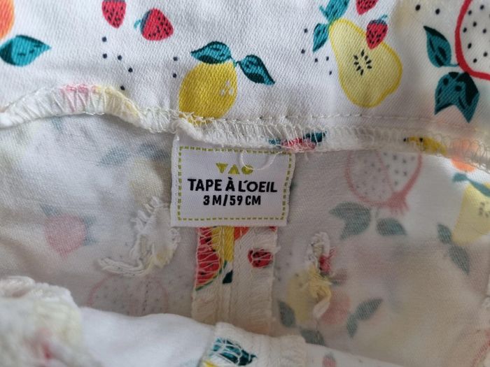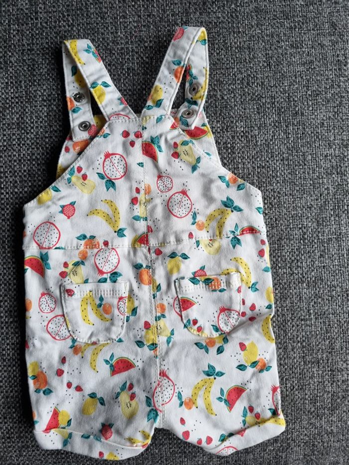 Salopette en jean 3 mois blanche motifs fruits (citrons, pastèque, fraises, bananes...) sur fond blanc. 2 pressions pour régler la hauteur des bretelles. Excellent état, porté 1 ou 2 fois