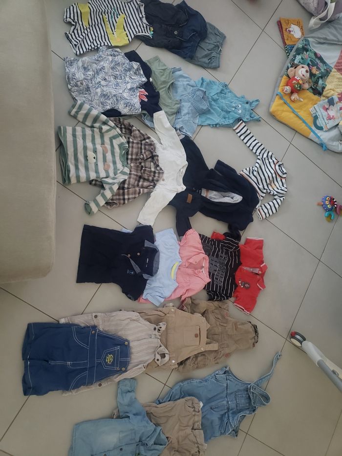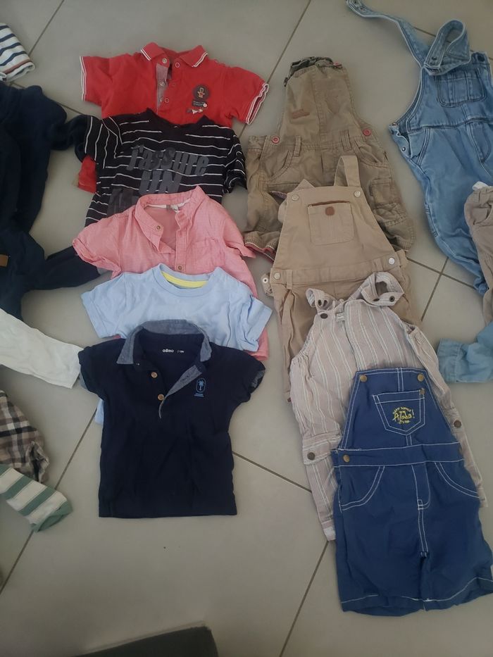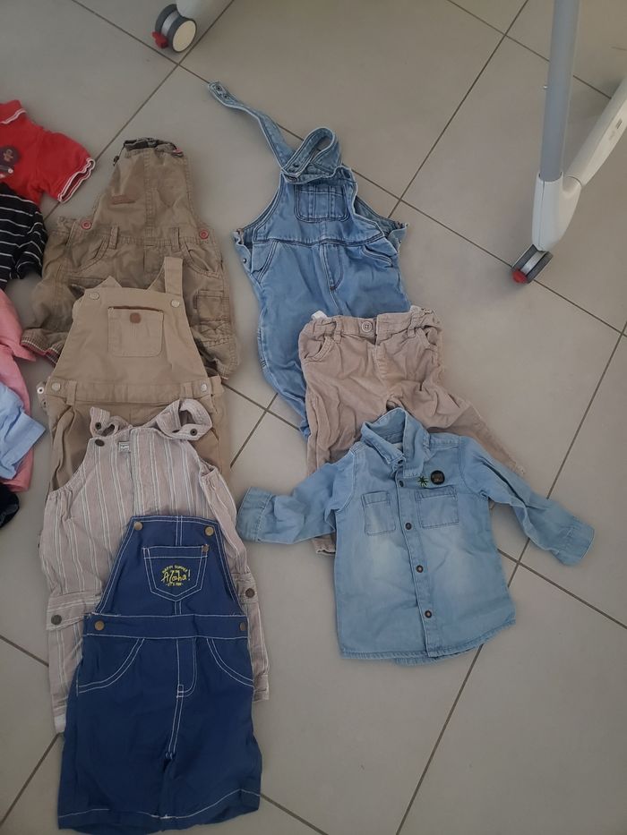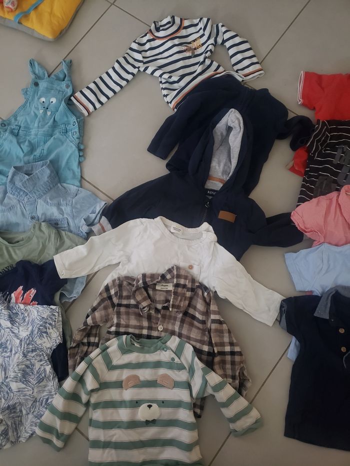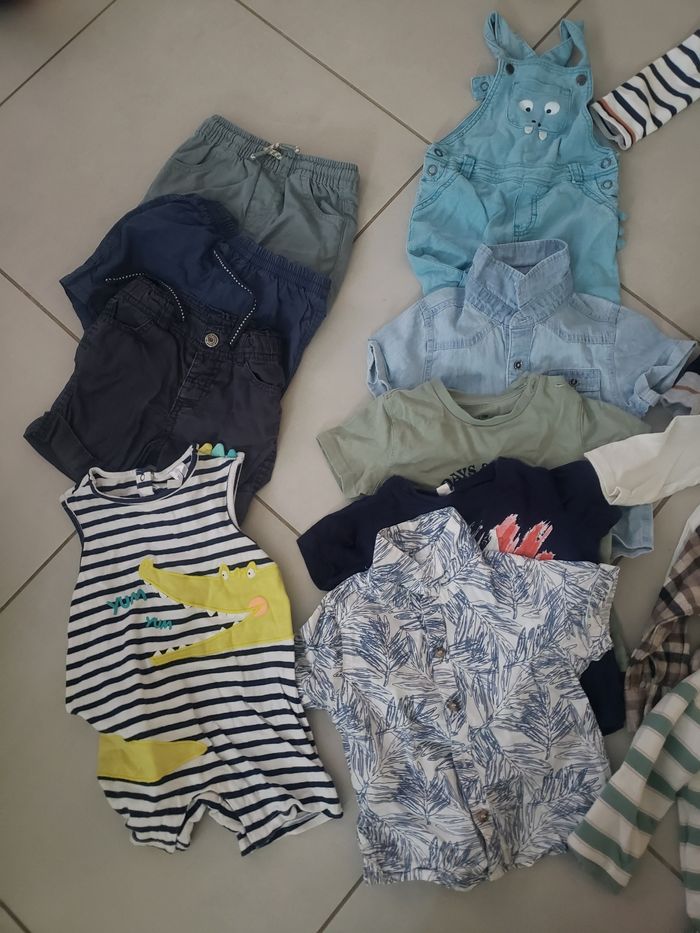1 barboteuse 3 short 5 salopettes courtes 1 salopette 1 pantalon 9 tee shirt MC 2 chemises ML 1 tee shirt ML. 1 sweat 2 gilets 1 maillot anti uv 12 mois