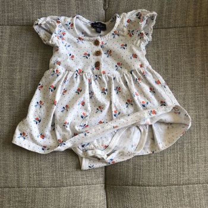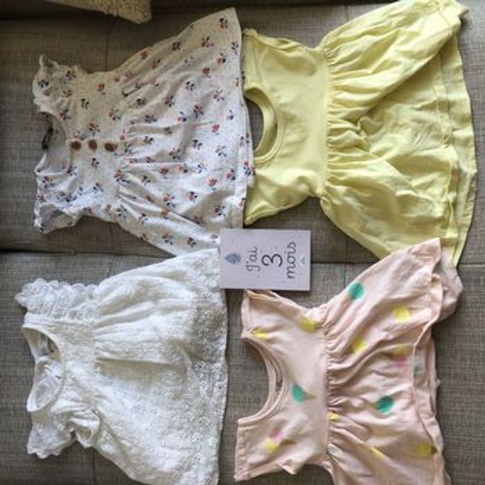 Lot de 4 robes taille 3 mois dont 2 robes Tex Baby en coton leger (jaune et rose) 1 robe Zara en dentelle 1 robe Sergent Major avec body intégré