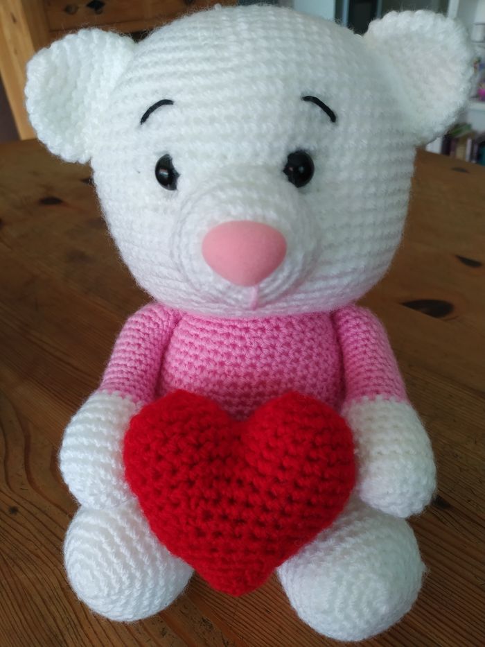 Ours réalisé au crochet, laine acrylique, yeux et nez de sécurité, position assise, hauteur 20 cm environ