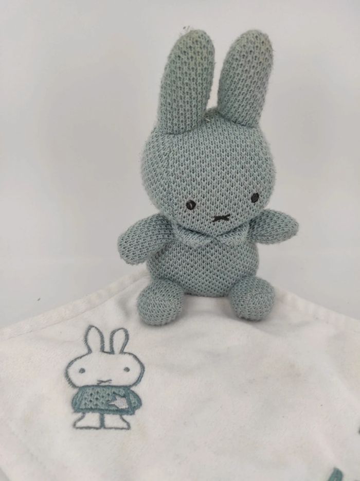 🐇 Doudou lapin Nijntje Miffy mouchoir plat blanc bleu Lapin bleu effet tricot. Broderie lapin et initiale sur le carré plat. 20*20 cm environs ✨ Occasion, très bon état. Vous achetez ce que vous voyez.