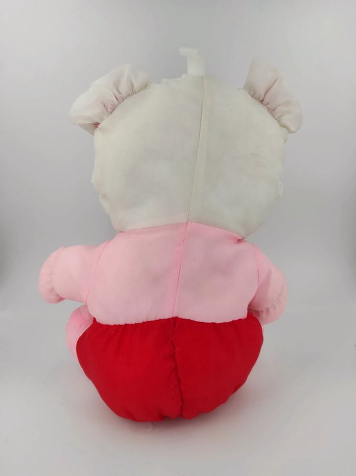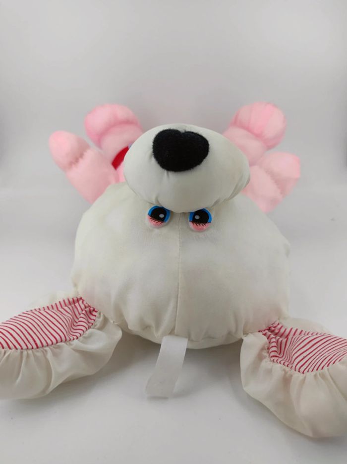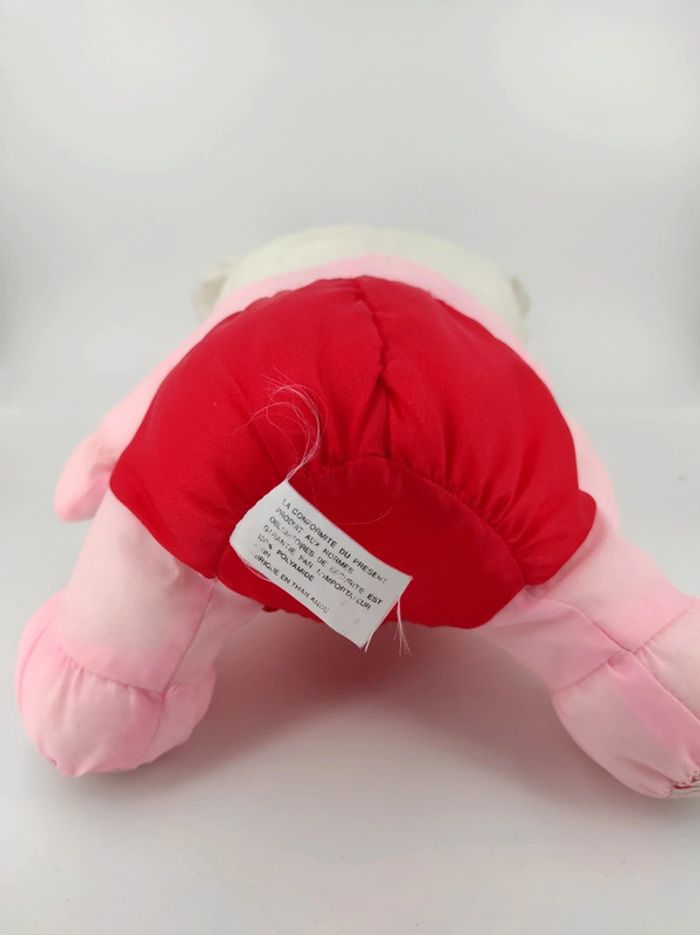 Peluche chien AUCHAN style Puffalump en toile parachute Peluche chien blanc et rose portant une culotte rouge et un noeud papillon à rayures multicolores. Yeux en plastique Dimension : environ 30 cm ✨ Occasion, en très bon état