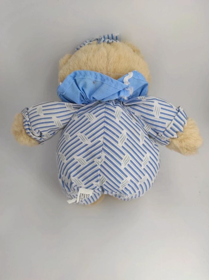 🐻 Ours beige en peluche avec tissu rayé bleu et blanc et bonnet de nuit. Produit par Europro SA. Environ 27 cm. ✨ Bon état. Bout du nez un peu abîmé. #ourseuropro