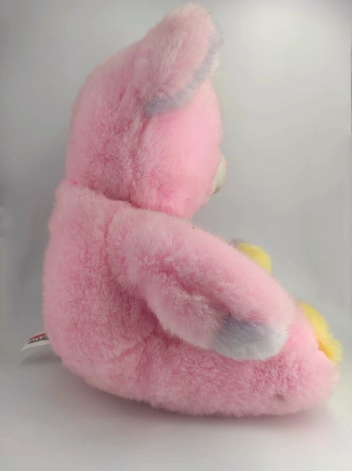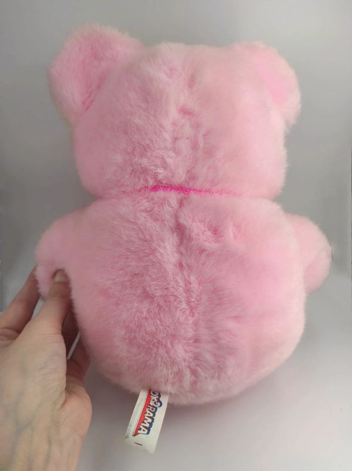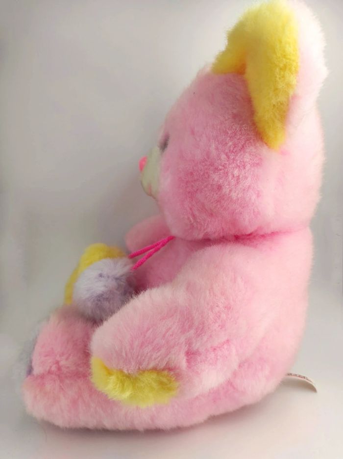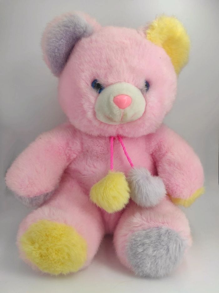 🧸 Doudou Peluche vintage Ours Ourson fourrure rose. Oreilles violet et jaune. Pompons jaune et violet. • Marque : Toy O-rama • Dimensions : environ 37 cm • Années : 90'-00' ✨ Bon état. Taché par endroits, je n'ai pas osé le passer en machine à laver. Mots clés : Peluche vintage casimir années 80 90 00 70 70' 80' 90' 00' Doudou Tomy 2002 80s 90s 00s 70s toile parachute poupée chiffon Fisher Price puffalump ours lion chat souris lapin violet blanc rayé cravate chapeau rose pompons jaune Toyorama #toyorama #peluchetoyorama #oursrosevintage #pelucheoursrosevintage