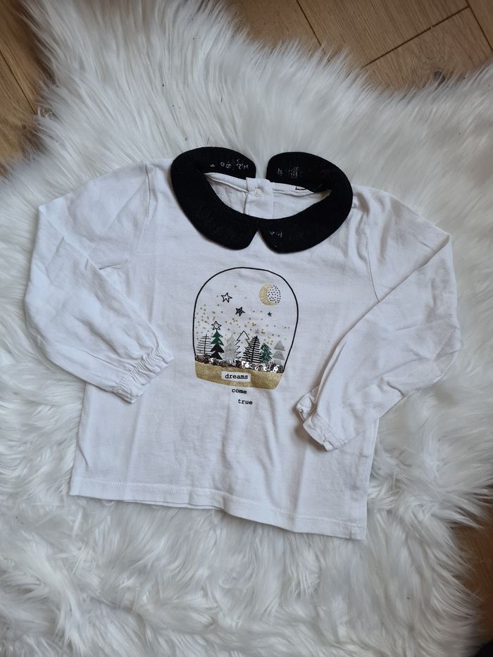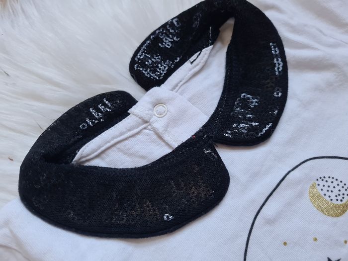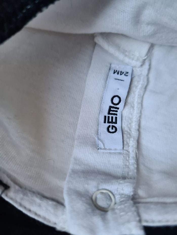 Haut blanc avec petite dessin Et le col noir en strasse . Gémo 24mois