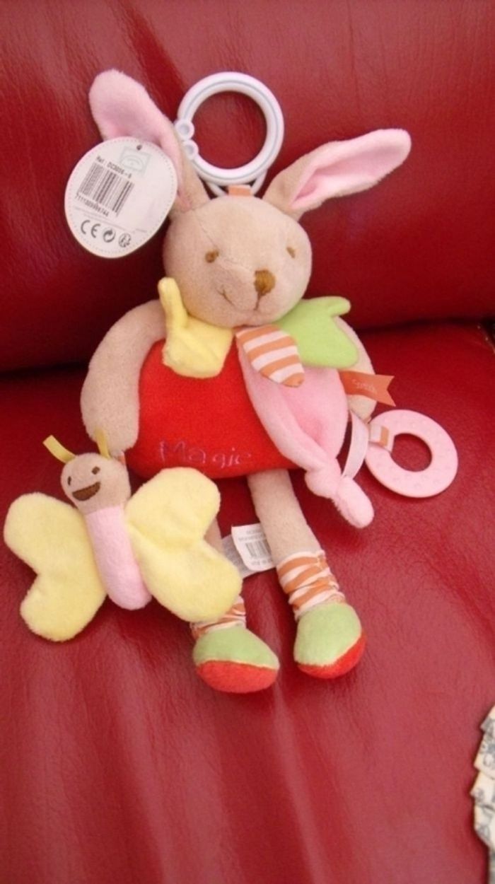 Article neuf, jamais utilisé, encore étiqueté : Peluche d'éveil marque "Doudou & Cie". Lapin "Magic" qui peut être suspendu;tête & corps rembourrés;bras-pattes et oreilles pouvant être mâchouillés; certaine parties font du bruit de papier froissé; anneau de dentition. Hauteur totale ( SANS les oreilles) de 26 cm // voir photos personnelles pour détails