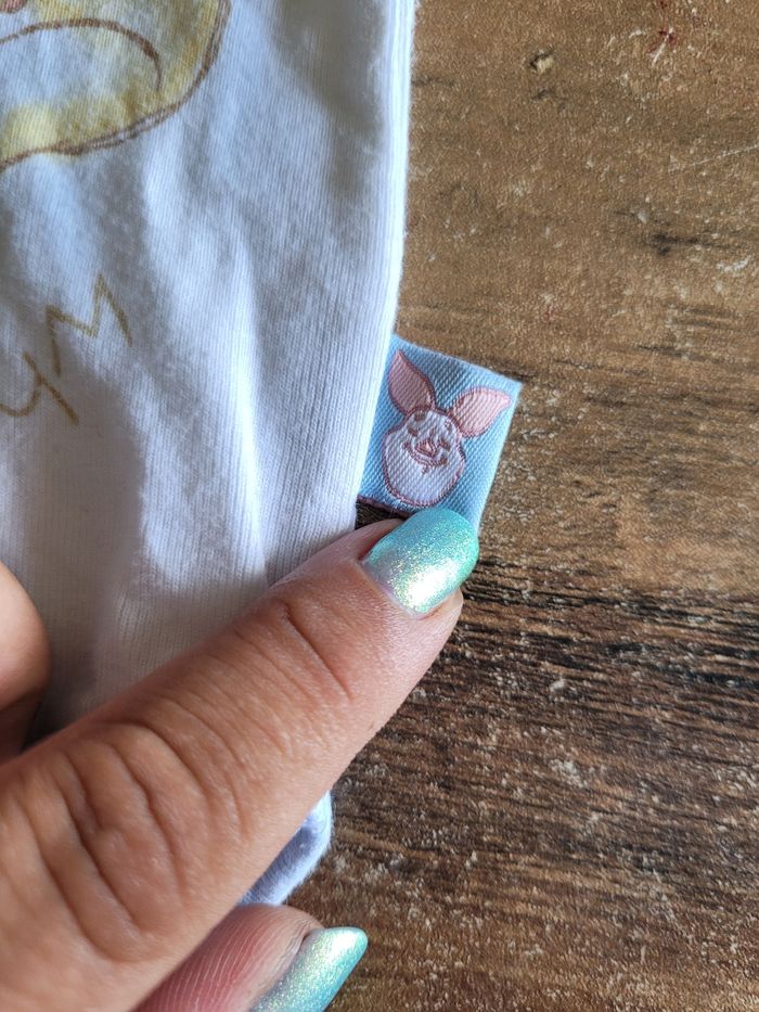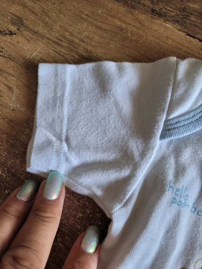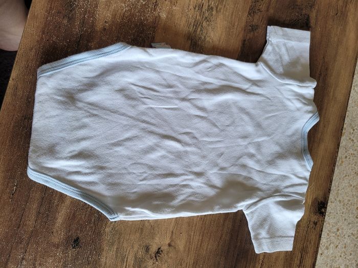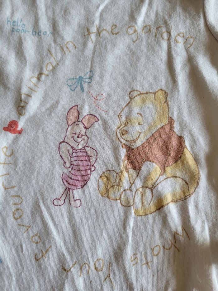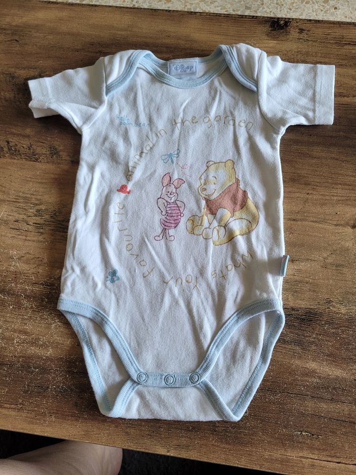 Petit bodie Manche court Mi saison Voir tous saison Taille 12 mois Matière 100 % coton Couleur blanc et bleu clair Dessin winnie et porcinet