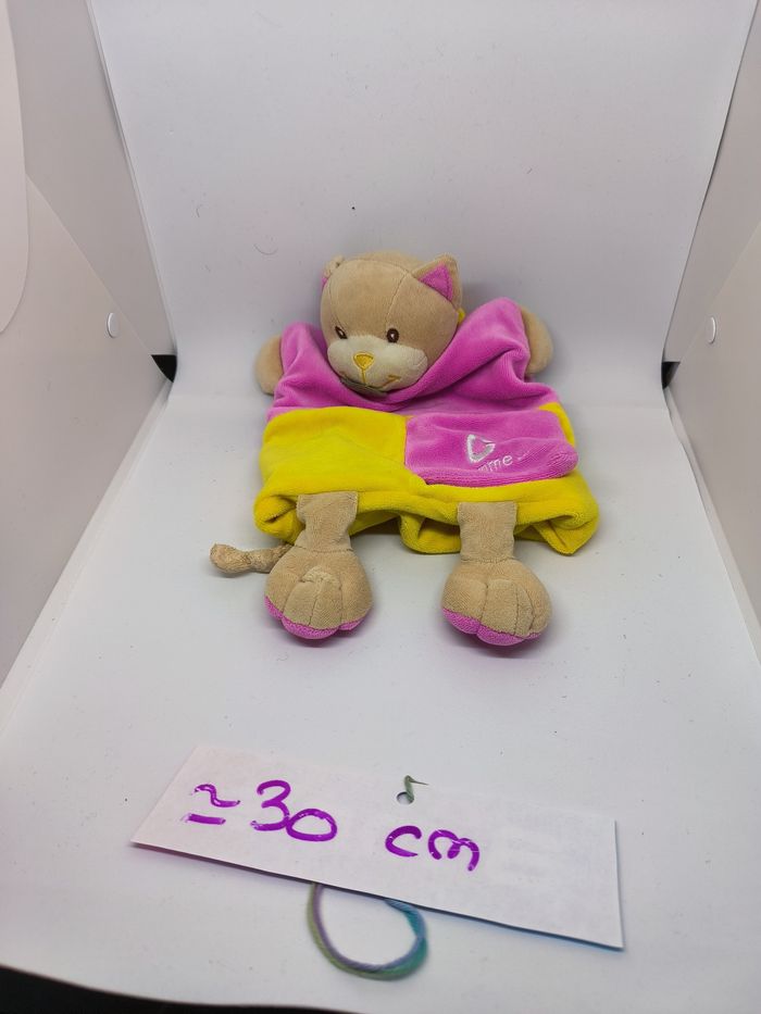 Doudou marionnette chat Rose et jaune On peut mettre la main dedans