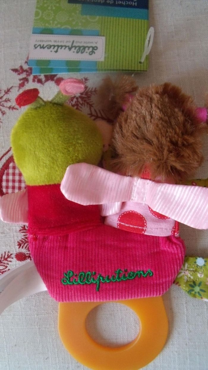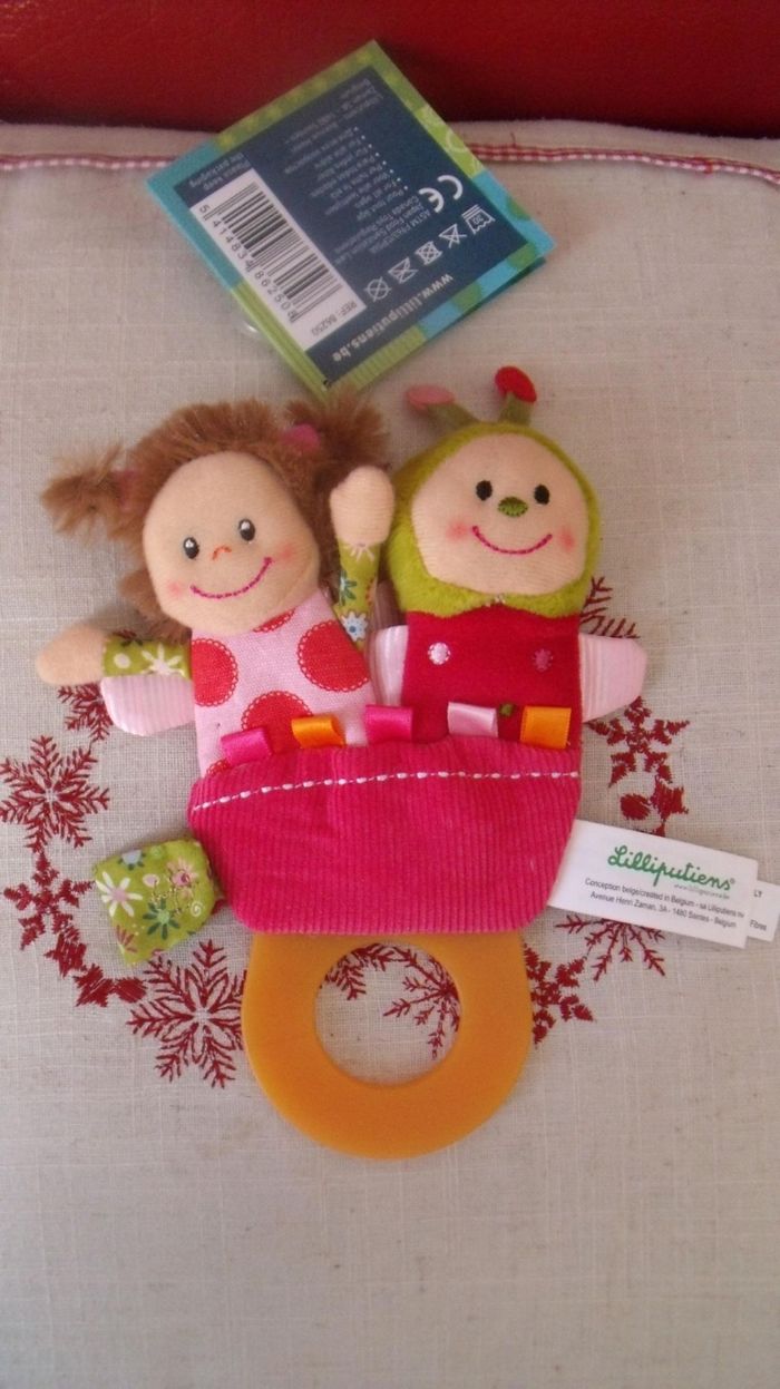 Article neuf,encore étiqueté: Hochet-Anneau de dentition souple avec 2 mini poupées-chiffon "Arnold & Coco" et emplacement accroche tétine. Les petits personnages peuvent également être mâchouillés et font un bruit de papier quand on appuie dessus . Bruit de grelot quand on le secoue // voir photos personnelles & internet pour détails. Vendu sans tétine