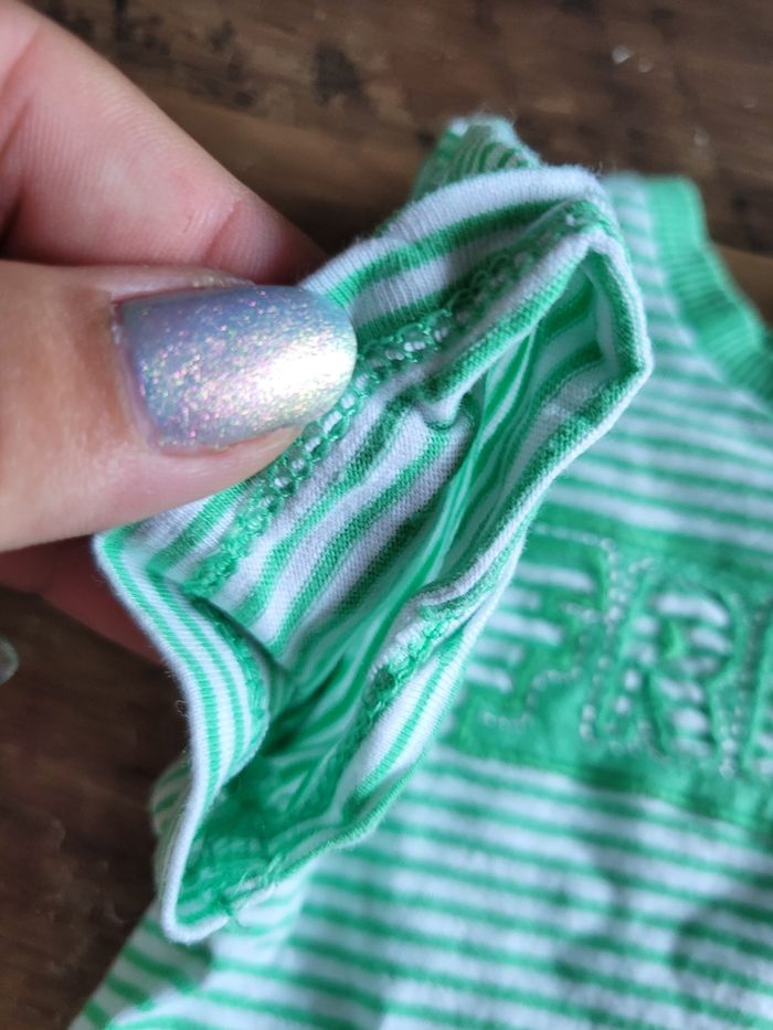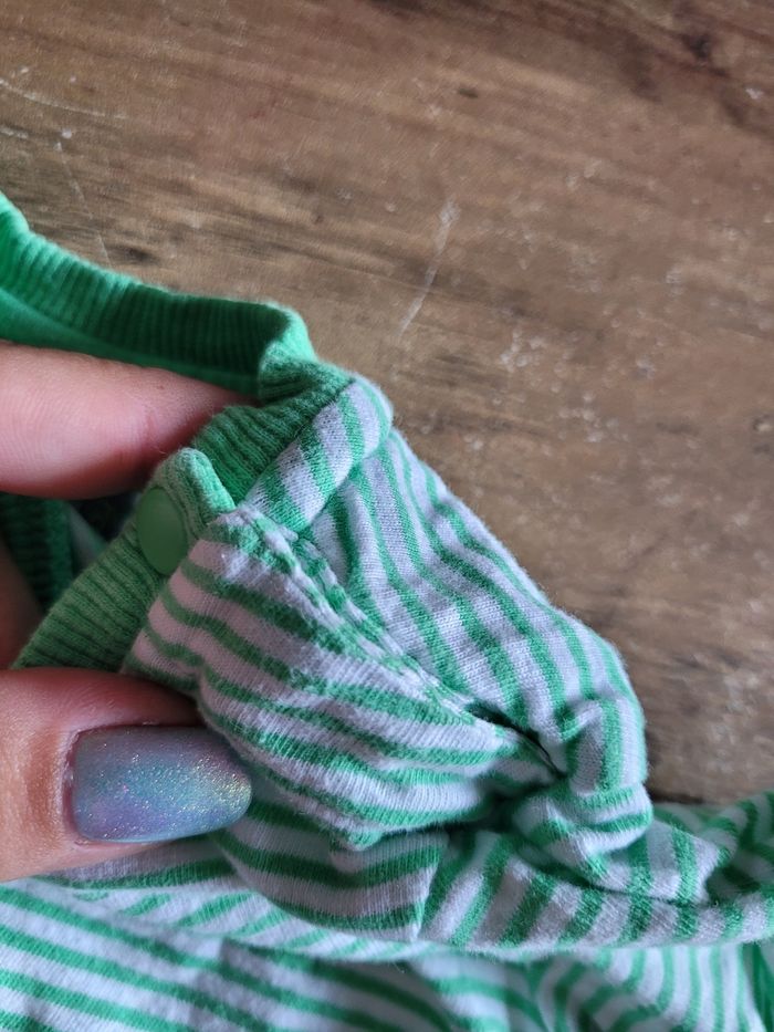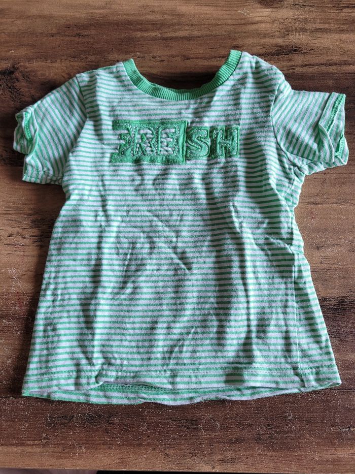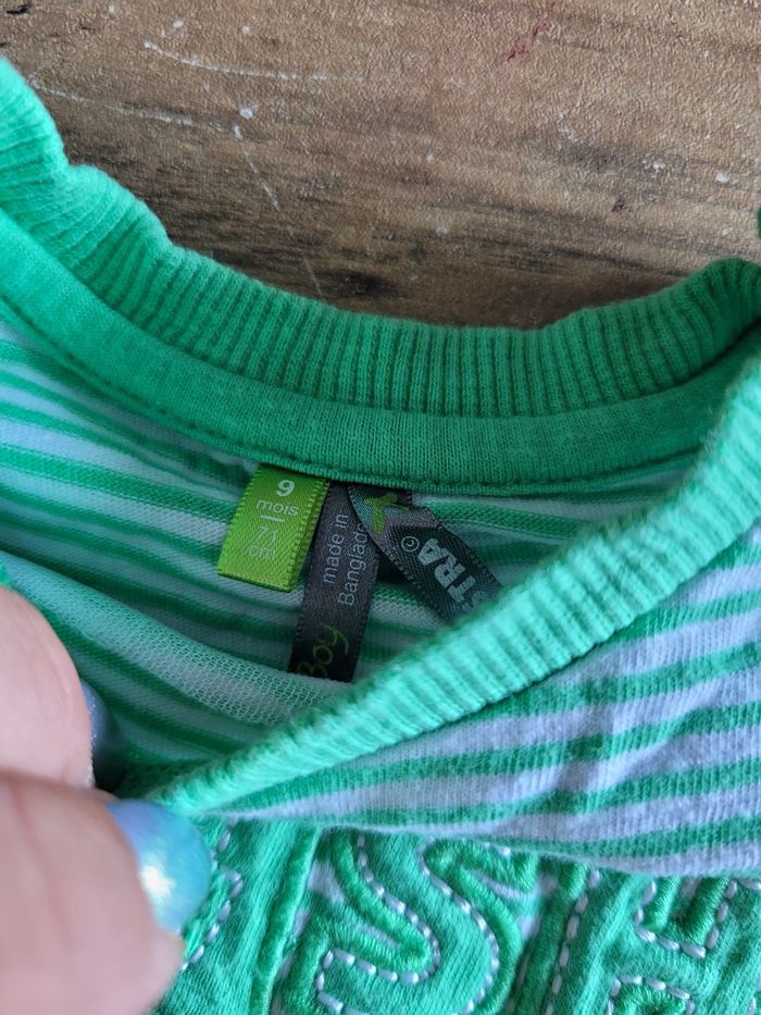 Petit T-shirt Manche court Mi saison Voir tous saison Taille 9 mois Couleur vert et blanc Attaché en haut a gauche Matière coton je pense
