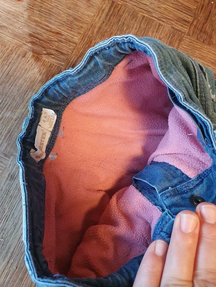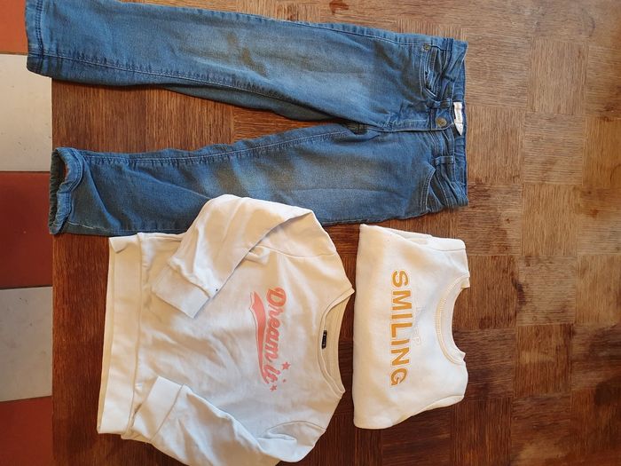 Lot 4 ans fille. Le pantalon est doublé idéal pour l'hiver. L'un des pulls est bouloché et à de petites taches