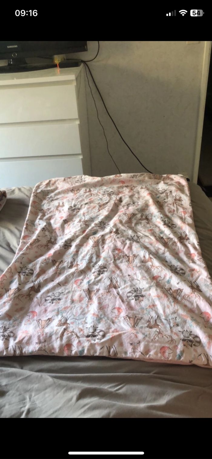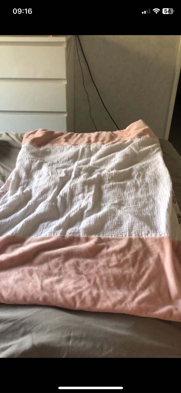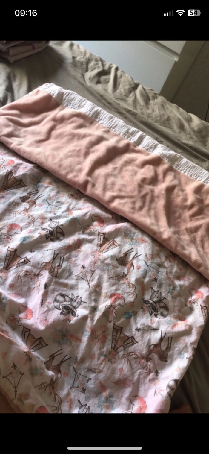 Bonjour je vend une couverture faite main Un coter blanc en gaz puis les extrémités en velours rose puis un coter imprimé petit renard , biche, tipi , flèche , raton laveur de coloris rose et blanc ainsi que doré Mise sur plusieurs site
