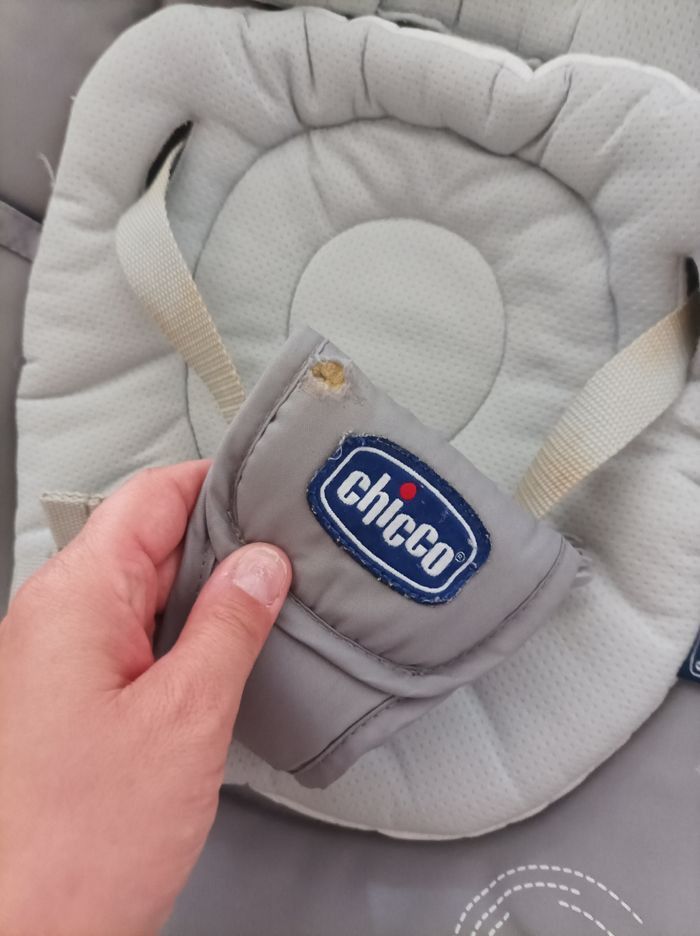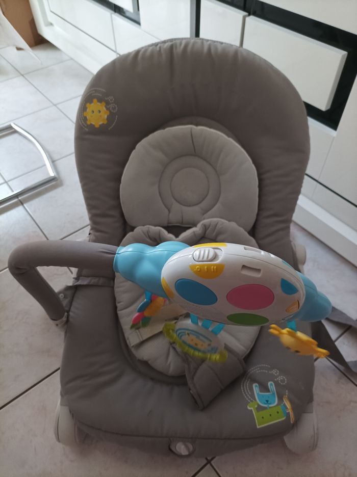 Transat musical et vibrant Un léger trou sur la sangle du milieu mais ne gêne en rien la sécurité de l' enfant Repose en main propre privilégié autour de vannes 56