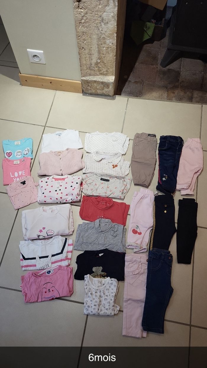 Lot 6 mois fille comprenant: 3 Tee-shirts manches courtes. 3 gilets 1 pull 9 hauts manches longues 7 pantalons Et 1 legging. Plus de photo disponible sur demande
