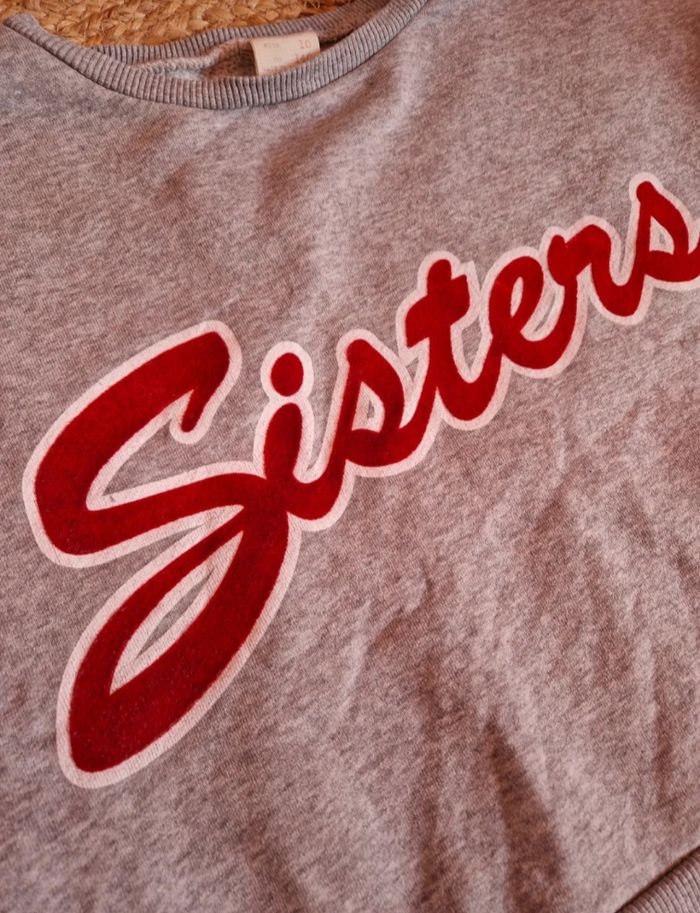 Super sweat large coupe oversize court de couleur gris chiné avec inscription "sisters" en rouge et blanc. Enfilage par la tête. Pratique et confortable, va avec tout. Taille 10 ans de chez Zara. #zara #zarafille10ans #dressingdedihya10ans #fille10ans #sweatfille10ans #zaragirl10