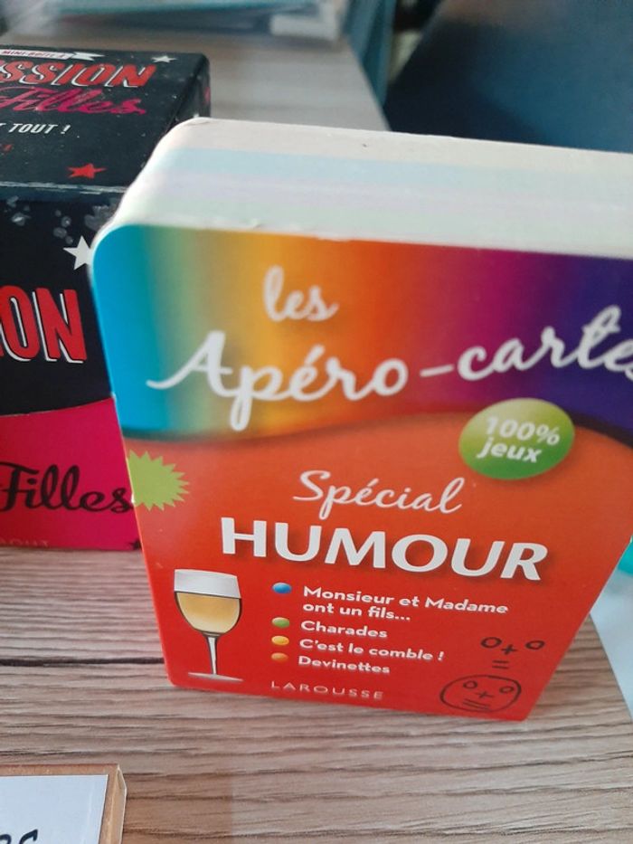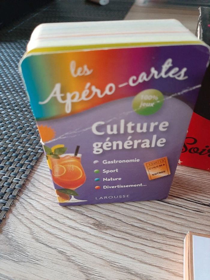 Packs de 4 jeux de cartes d'ambiance pour rigoler entre amis ou en famille lors des soirées. État satisfaisant pour les emballages de deux d'entre eux : Soirée Filles (utilisés plusieurs fois) et pour les cartes de Culture Générale (utilisées plusieurs fois également). Les cartes sont elle en très bon état. Les deux autres sont comme neufs. Vendu uniquement en lot.