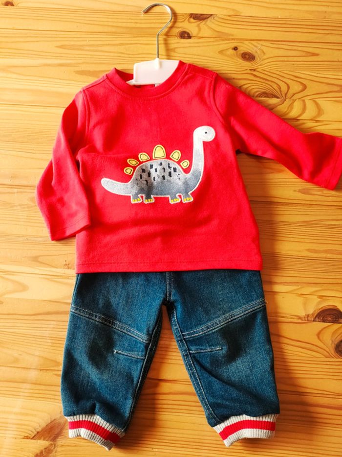 Tenue tee-shirt à manches longues rouge avec dinosaure + pantalon en jeans avec élastique au pied. Neuf jamais porté.